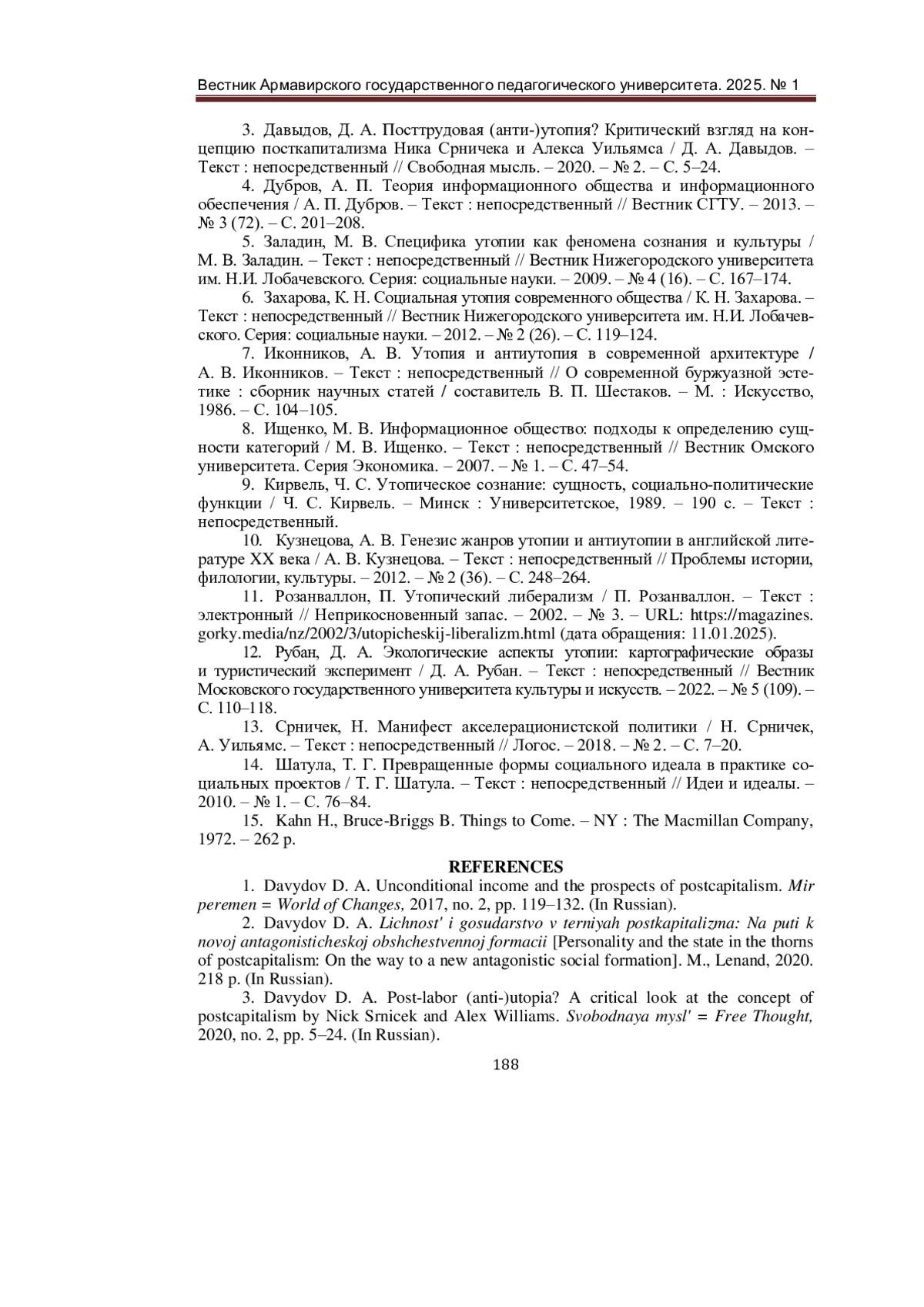1. Давыдов, Д. А. Безусловный доход и перспективы посткапитализма / Д. А. Давыдов. - Текст: непосредственный // Мир перемен. - 2017. - № 2. - С. 119-132. EDN: YUQLHV