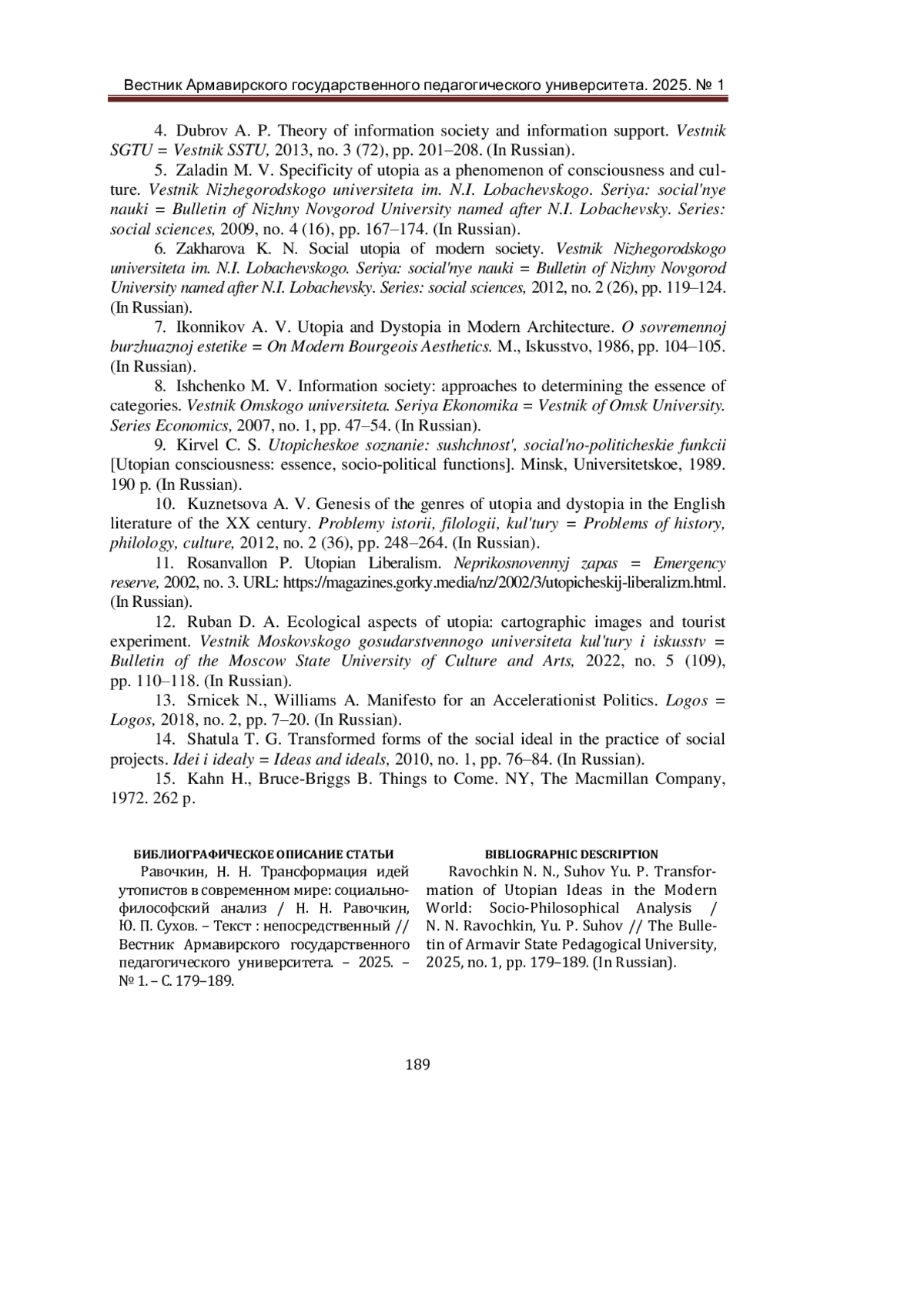 6. Захарова, К. Н. Социальная утопия современного общества / К. Н. Захарова. - Текст: непосредственный // Вестник Нижегородского университета им. Н.И. Лобачевского. Серия: социальные науки. - 2012. - № 2 (26). - С. 119-124. EDN: PFTMHV