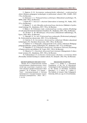 5. Даутова, О. Б. Современные педагогические технологии в профессиональной школе / О. Б. Даутова, О. Н. Крылова. - СПб.: КАРО, 2022. - 176 с. - Текст: непосредственный.