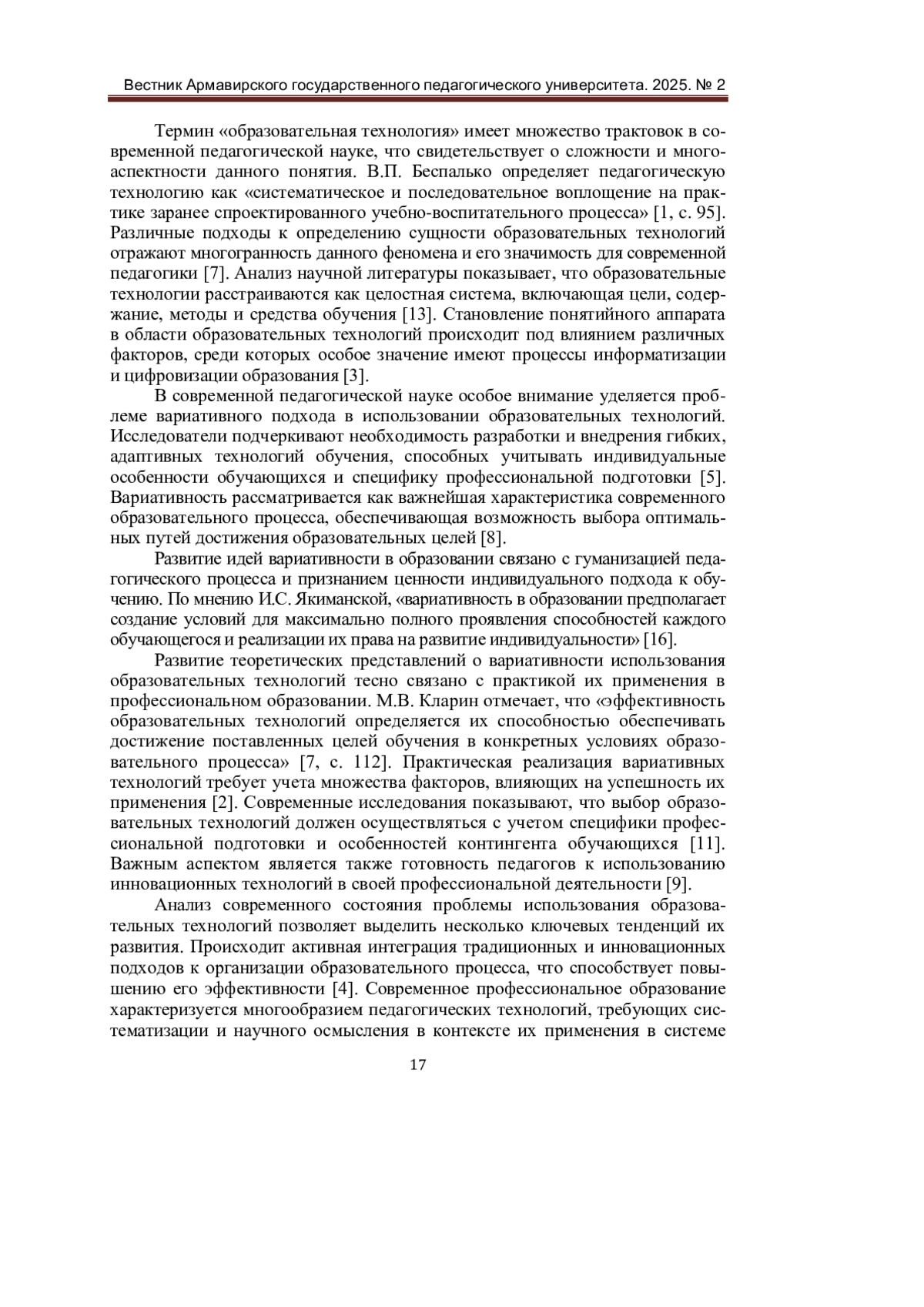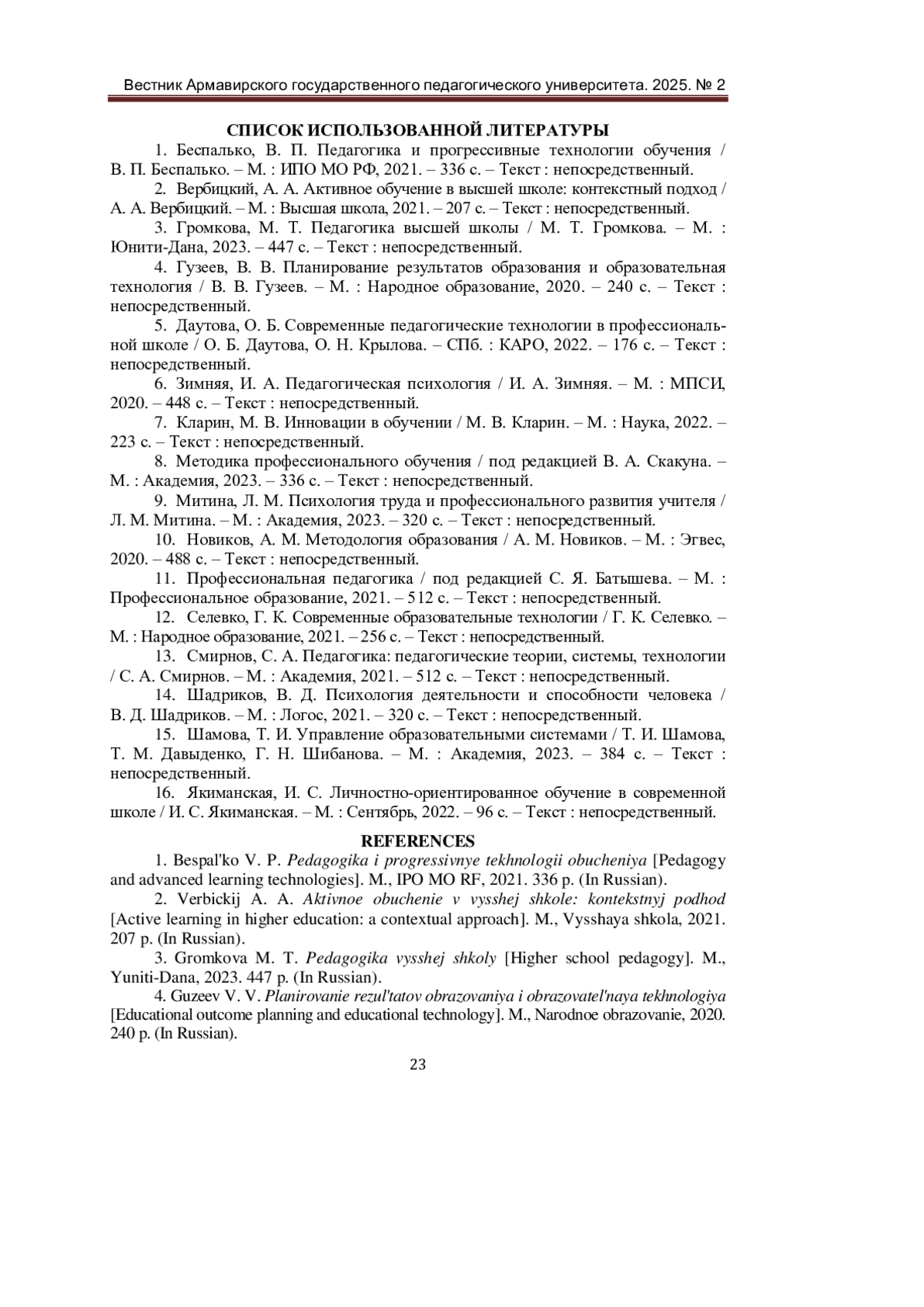 1. Беспалько, В. П. Педагогика и прогрессивные технологии обучения / В. П. Беспалько. - М.: ИПО МО РФ, 2021. - 336 с. - Текст: непосредственный.
