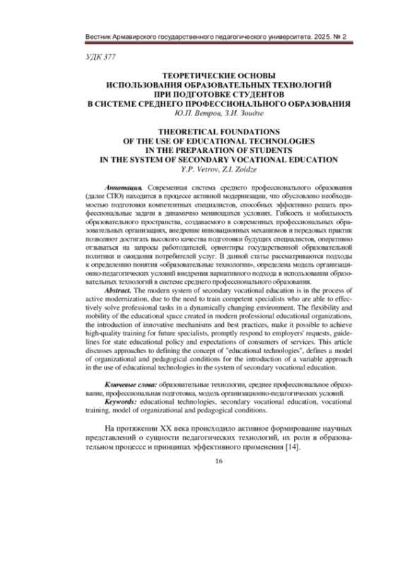 Современная система среднего профессионального образования (далее СПО) находится в процессе активной модернизации, что обусловлено необходимостью подготовки компетентных специалистов, способных эффективно решать профессиональные задачи в динамично меняющихся условиях. Гибкость и мобильность образовательного пространства, создаваемого в современных профессиональных образовательных организациях, внедрение инновационных механизмов и передовых практик позволяют достигать высокого качества подготовки будущих специалистов, оперативно отзываться на запросы работодателей, ориентиры государственной образовательной политики и ожидания потребителей услуг. В данной статье рассматриваются подходы к определению понятия «образовательные технологии», определена модель организационно-педагогических условий внедрения вариативного подхода в использовании образовательных технологий в системе среднего профессионального образования.