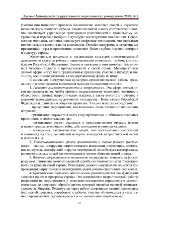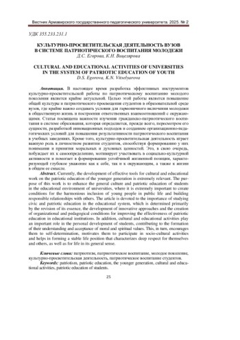 В настоящее время разработка эффективных инструментов культурно-просветительской работы по патриотическому воспитанию молодого поколения является крайне актуальной. Целью этой работы является повышение общей культуры и патриотического просвещения студентов в образовательной среде вузов, где крайне важно создавать условия для гармоничного включения молодежи в общественную жизнь и построения ответственных взаимоотношений с окружающими. Статья посвящена важности изучения гражданско-патриотического воспитания в системе образования, которая определяется, прежде всего, пересмотром его сущности, разработкой инновационных подходов и созданием организационно-педагогических условий для повышения результативности патриотического воспитания в учебных заведениях. Кроме того, культурно-просветительская деятельность играет важную роль в личностном развитии студентов, способствуя формированию у них понимания и принятия моральных и духовных ценностей. Это, в свою очередь, побуждает их к самоопределению, мотивирует участвовать в социально-культурной активности и помогает в формировании устойчивой жизненной позиции, характеризующей глубокое уважение как к себе, так и к окружающим, а также к жизни в общем ее смысле.