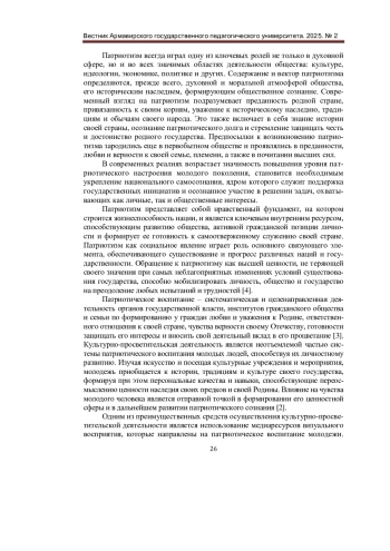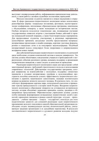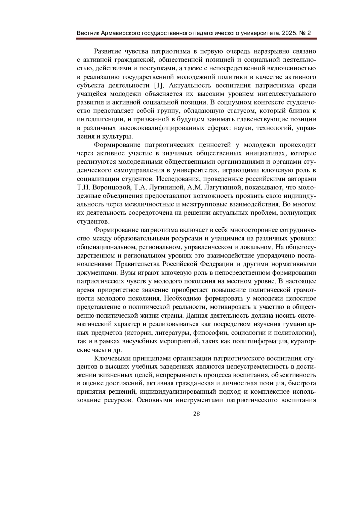 4. Ткаченко, В. В. Патриотическое воспитание молодежи / В. В. Ткаченко. - Текст: электронный // Вестник Брянского государственного университета. - 2011. - № 2. - URL: https://cyberleninka.ru/article/n/patrioticheskoe-vospitanie-molodezhi-1 (дата обращения: 21.04.2025). EDN: ONWYQZ