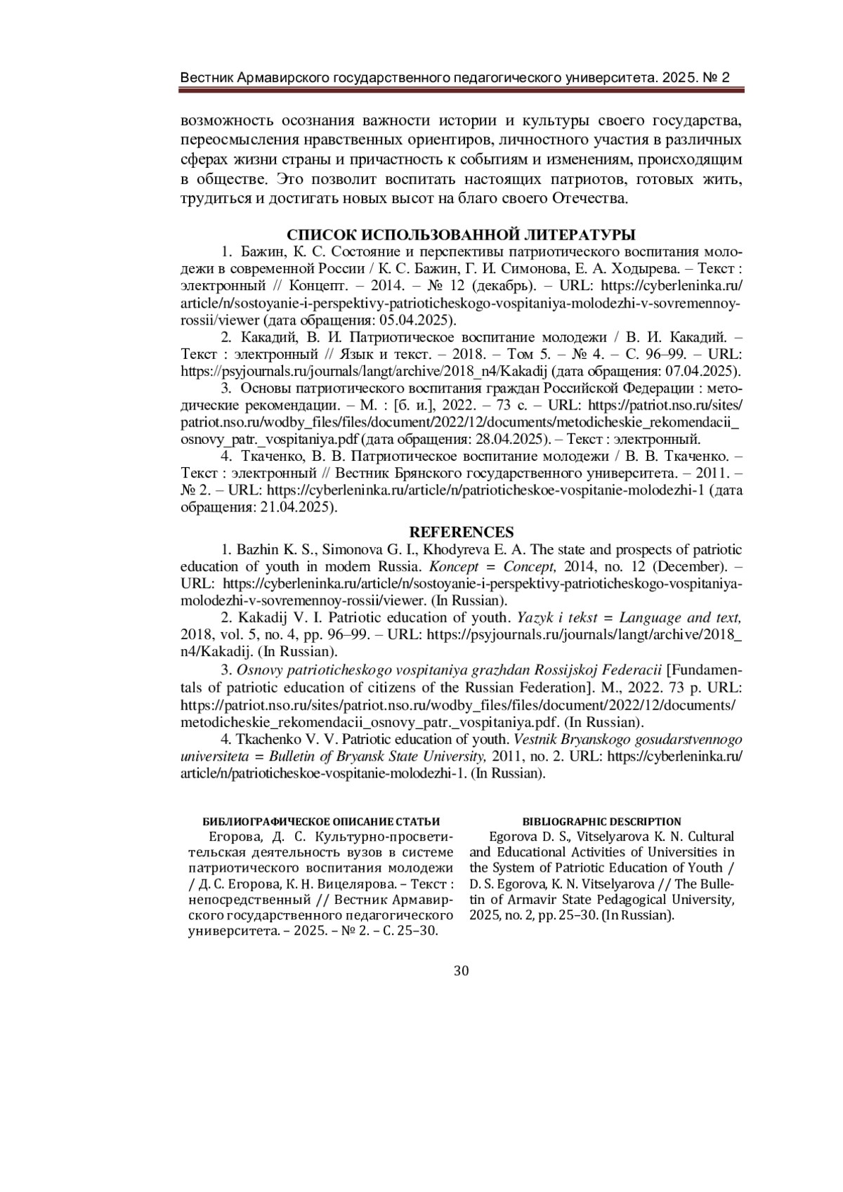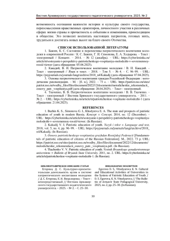 1. Бажин, К. С. Состояние и перспективы патриотического воспитания молодежи в современной России / К. С. Бажин, Г. И. Симонова, Е. А. Ходырева. - Текст: электронный // Концепт. - 2014. - № 12 (декабрь). - URL: https://cyberleninka.ru/article/n/sostoyanie-i-perspektivy-patrioticheskogo-vospitaniya-molodezhi-v-sovremennoy-rossii/viewer (дата обращения: 05.04.2025).