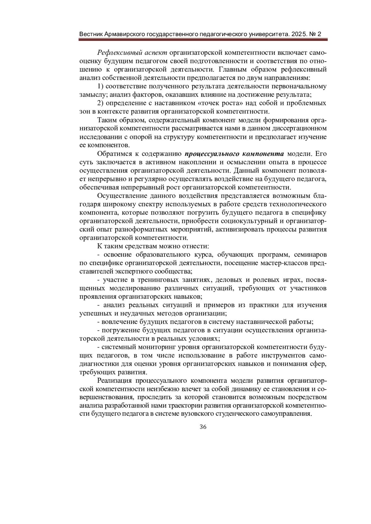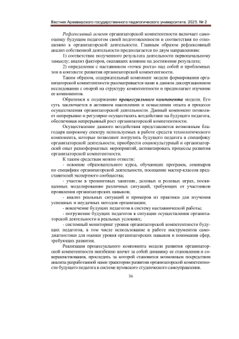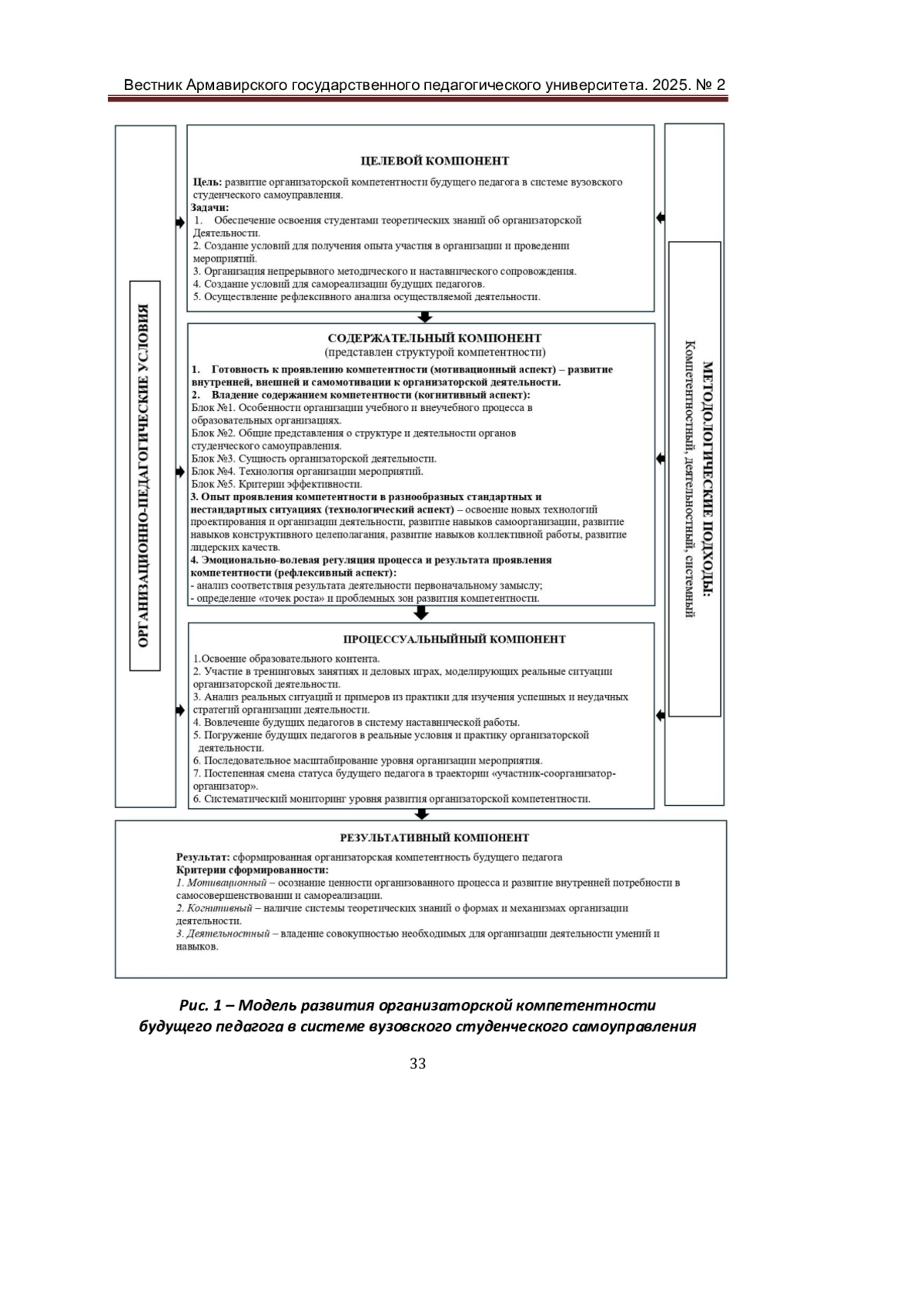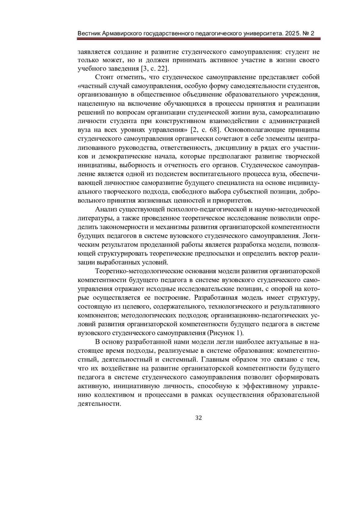 В статье рассматриваются особенности формирования организаторской компетентности будущих педагогов в системе вузовского студенческого самоуправления. В работе представлена авторская модель развития организаторской компетентности будущего педагога в системе вузовского студенческого самоуправления, описаны ее ключевые компоненты и их содержание. Также в статье рассматриваются подходы к пониманию сущности студенческого самоуправления, описана его структура, принципы организации и существующие модели его построения, в рамках которых могут быть созданы организационно-педагогические условия для развития организаторской компетентности.