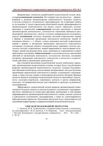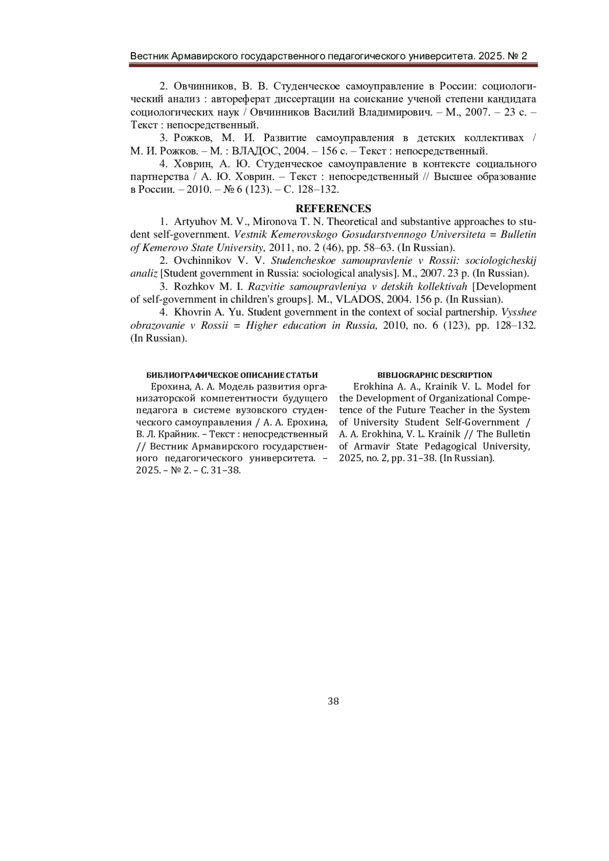1. Артюхов, М. В. Теоретические и содержательные подходы к студенческому самоуправлению / М. В. Артюхов, Т. Н. Миронова. - Текст: непосредственный // Вестник Кемеровского государственного университета. - 2011. - № 2 (46). - С. 58-63.