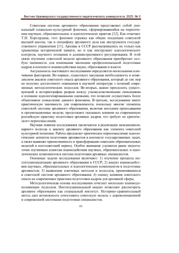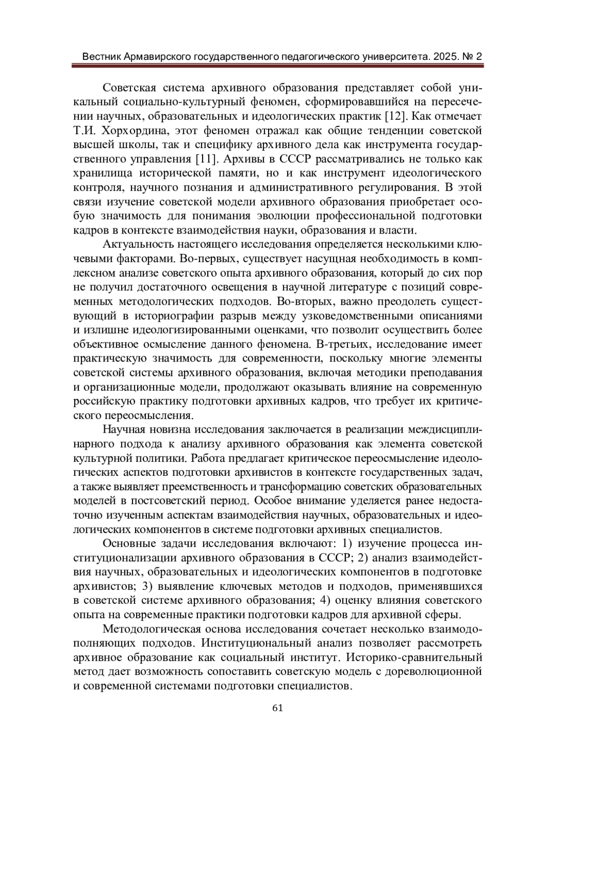 Советская система архивного образования представляет собой уникальный социально-культурный феномен, сформировавшийся на пересечении научных, образовательных и идеологических практик [12]. Как отмечает Т. И. Хорхордина, этот феномен отражал как общие тенденции советской высшей школы, так и специфику архивного дела как инструмента государственного управления [11]. Архивы в СССР рассматривались не только как хранилища исторической памяти, но и как инструмент идеологического контроля, научного познания и административного регулирования. В этой связи изучение советской модели архивного образования приобретает особую значимость для понимания эволюции профессиональной подготовки кадров в контексте взаимодействия науки, образования и власти.
