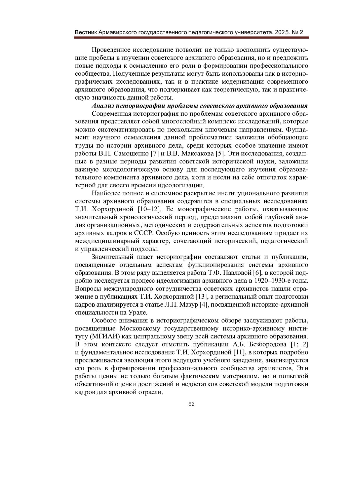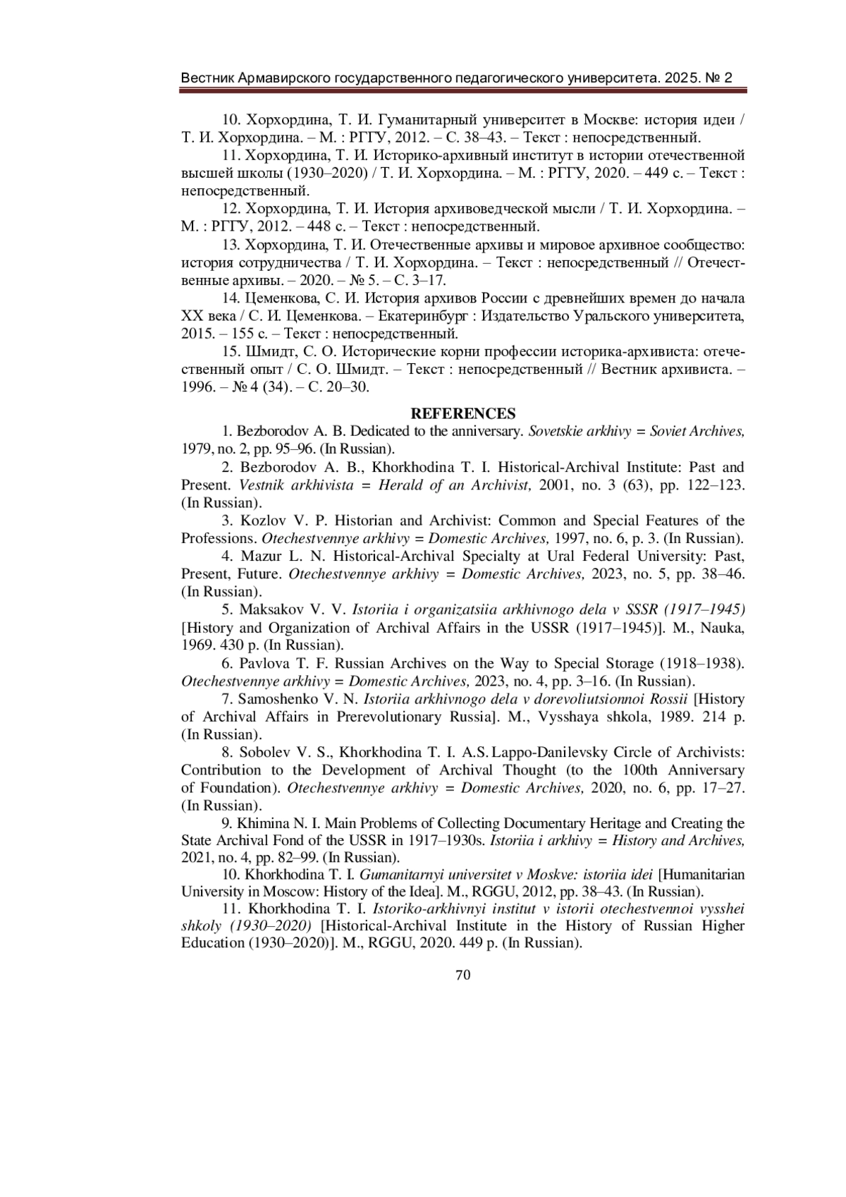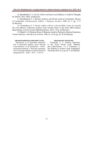 13. Хорхордина, Т. И. Отечественные архивы и мировое архивное сообщество: история сотрудничества / Т. И. Хорхордина. - Текст: непосредственный // Отечественные архивы. - 2020. - № 5. - С. 3-17. EDN: CZSIKV