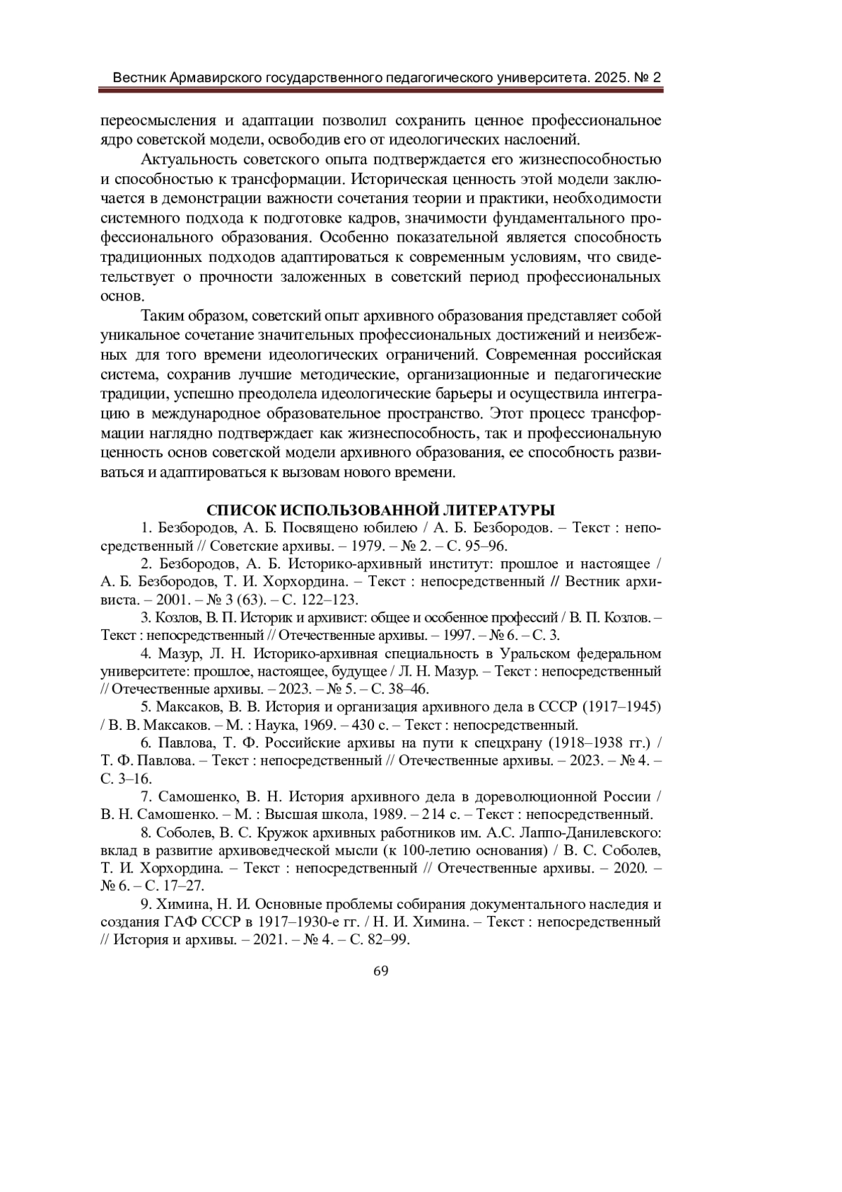 2. Безбородов, А. Б. Историко-архивный институт: прошлое и настоящее / А. Б. Безбородов, Т. И. Хорхордина. - Текст: непосредственный // Вестник архивиста. - 2001. - № 3 (63). - С. 122-123. EDN: PFBNOB