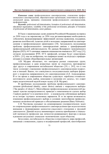 В Указе о национальных целях развития Российской Федерации на период до 2030 года и на перспективу до 2036 года регламентирована необходимость «обеспечить функционирование эффективной системы выявления, поддержки, развития способностей, талантов детей и молодежи, направленной на самоопределение и профессиональную ориентацию» [18]. Актуальность исследования проблемы профессионального самоопределения связана с трансформацией профессиональной действительности. По данным Всемирного экономического форума (2023), 44 % ключевых навыков специалистов изменятся к 2027 году [11]; согласно исследованию IFTF, 85 % профессий, которые будут существовать в 2030 г. [11], еще не изобретены, что напрямую влияет на подходы к профориентации в условиях общеобразовательных организаций.