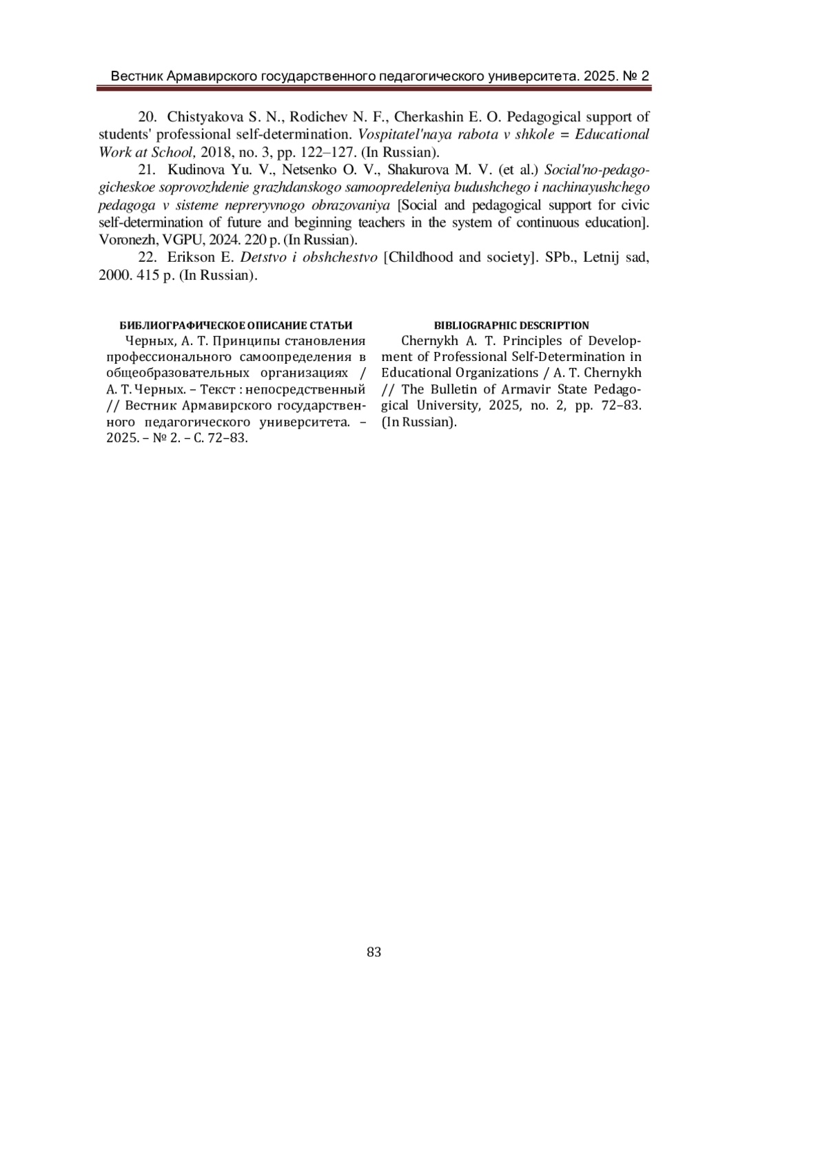 19. Черных, А. Т. Становление профессионального самоопределения в образовательных организациях / А. Т. Черных. - Текст: непосредственный // Педагогическое образование: традиции и инновации, пространство и возможности: сборник статей участников Международной научно-практической конференции, посвященной 90-летию педагогического образования в Арзамасе (г. Арзамас, 19-20 ноября 2024 года). - Арзамас: Национальный исследовательский Нижегородский государственный университет им. Н.И. Лобачевского, 2024. - С. 265-267. EDN: DJNWXQ
