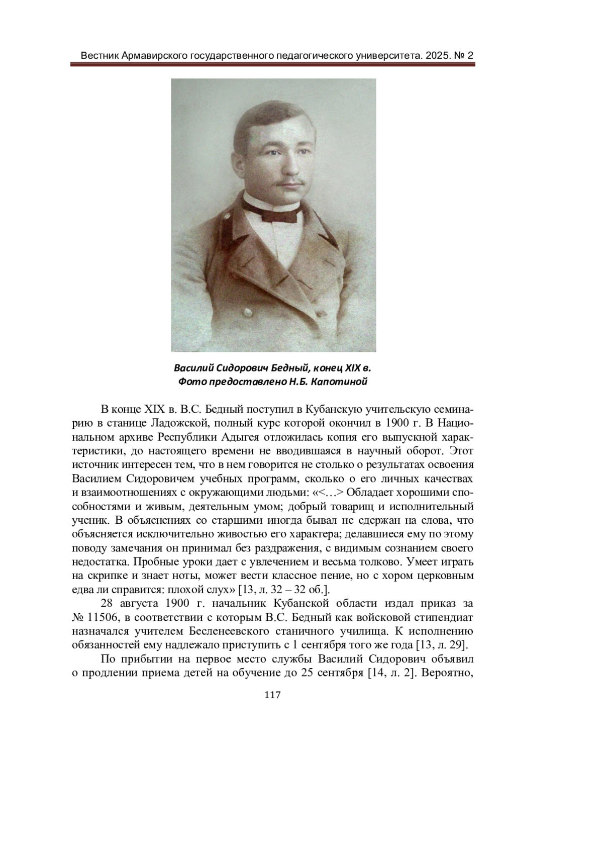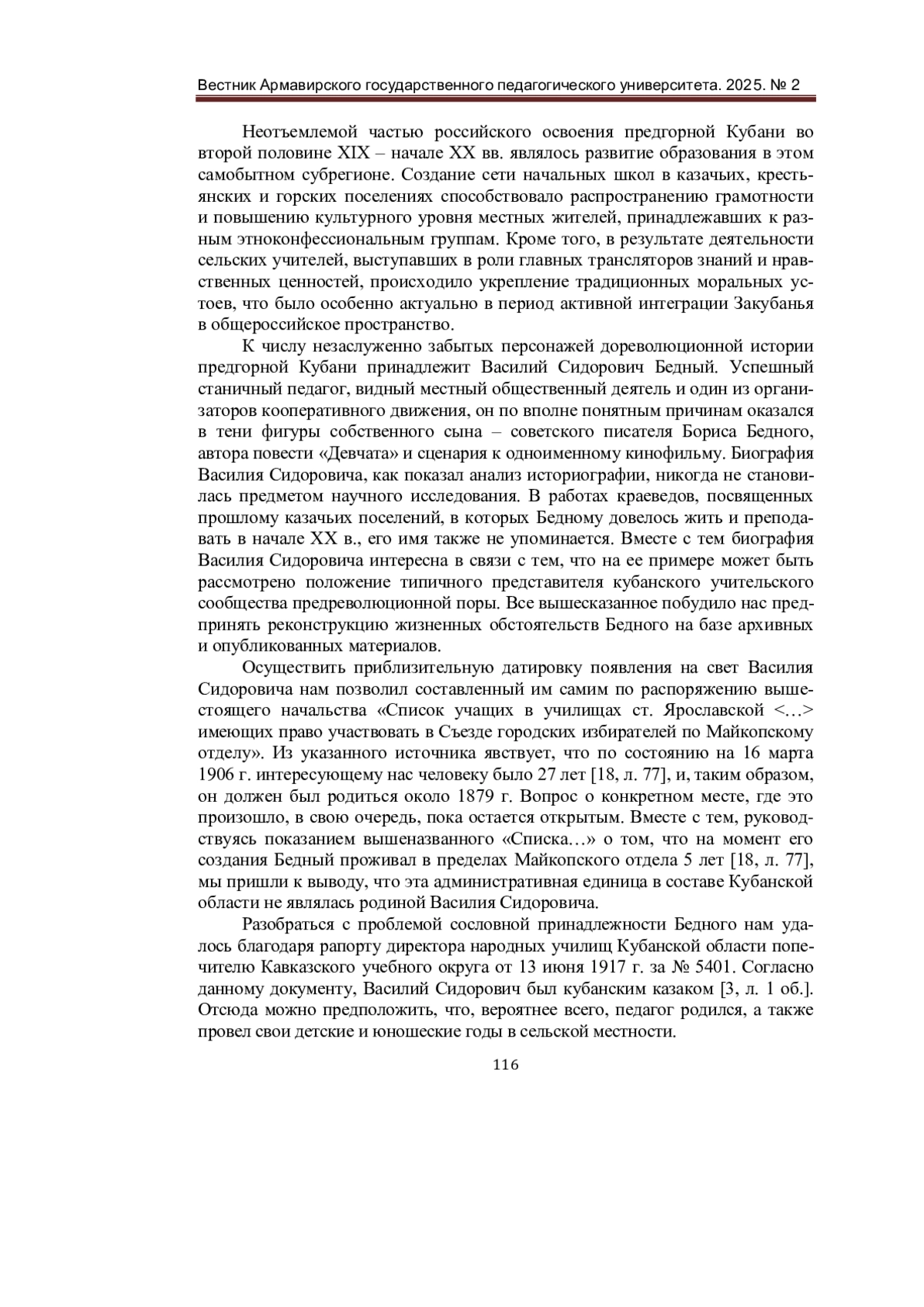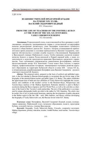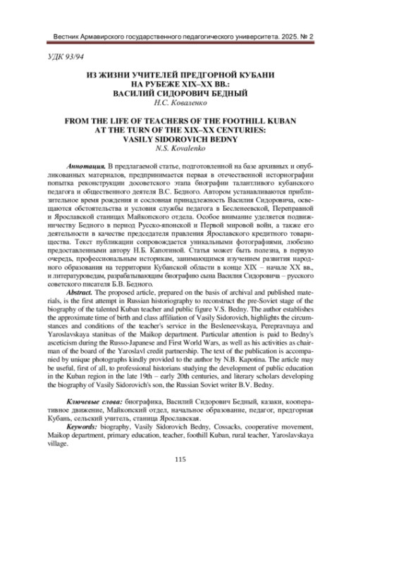 В предлагаемой статье, подготовленной на базе архивных и опубликованных материалов, предпринимается первая в отечественной историографии попытка реконструкции досоветского этапа биографии талантливого кубанского педагога и общественного деятеля В. С. Бедного. Автором устанавливаются приблизительное время рождения и сословная принадлежность Василия Сидоровича, освещаются обстоятельства и условия службы педагога в Бесленеевской, Переправной и Ярославской станицах Майкопского отдела. Особое внимание уделяется подвижничеству Бедного в период Русско-японской и Первой мировой войн, а также его деятельности в качестве председателя правления Ярославского кредитного товарищества. Текст публикации сопровождается уникальными фотографиями, любезно предоставленными автору Н. Б. Капотиной. Статья может быть полезна, в первую очередь, профессиональным историкам, занимающимся изучением развития народного образования на территории Кубанской области в конце XIX - начале XX вв., и литературоведам, разрабатывающим биографию сына Василия Сидоровича - русского советского писателя Б. В. Бедного.