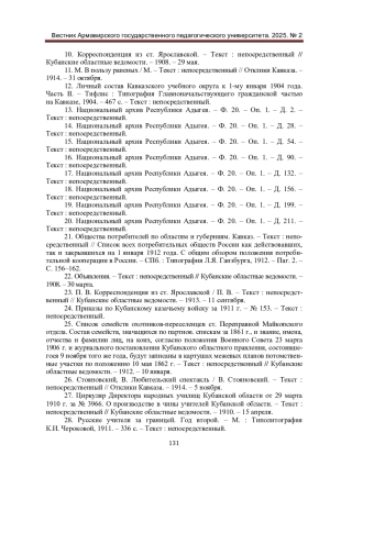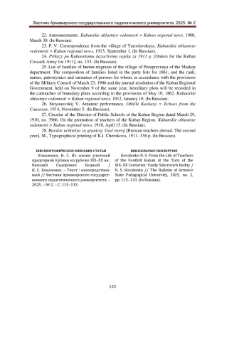 23. П. В. Корреспонденция из ст. Ярославской / П. В. - Текст: непосредственный // Кубанские областные ведомости. - 1913. - 11 сентября.