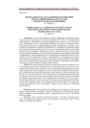 В статье анализируются практики обращения к предшествующему опыту в один из переломных для отечества периодов 1917-1919 гг. Осознание такой необходимости у вовлеченных в противостояние сторон появилось тогда отнюдь не сразу. Оказавшаяся у власти группировка РСДРП(б), в отличие от оппонентов, имела возможность опираться на сформулированные ранее программные установки, что в условиях революционного кризиса и являвшейся его отражением Гражданской войны предоставляло немалые преимущества. Из-за отсутствия предварительно составленной идеологической платформы организаторы белого движения на Юге России ставку делали на разрабатывавшиеся и частично осуществлявшиеся ранее реформы. Реализация и эффективность задействовавшихся ими мотивирующих воздействий остается неизученной. С учетом допустимого объема в представляемом исследовании рассмотрены лишь наиболее значимые аспекты. Использовавшиеся же результативные и неудачные подходы, по мнению автора, актуальны и при устранении современных представляющих опасность для российской государственности угроз.
