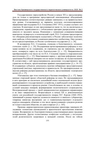 Государственное переустройство России в начале XX в. предусматривалось не только в программах представителей оппозиционных объединений. Проектированием соответствующих реформ занимались и на правительственном уровне. Составлявшиеся их варианты получали систематизированное оформление при поддержке П. А. Столыпина (1861–1911), а в ряде случаев с его участием. В некоторых из них прослеживается также то, что не исключалось и утверждение справедливости с соблюдением критерия распределения в зависимости от трудового вклада. Изменению с элементами усовершенствования намечалось подвергнуть и политический строй. П. А. Столыпин предостерегал, что обещания революционеров осуществить в России «абсолютные политические свободы, и безусловное социальное равенство» несбыточны. Они сделают, по его предостережению, из России «утопическое государство» [1, с. 26].