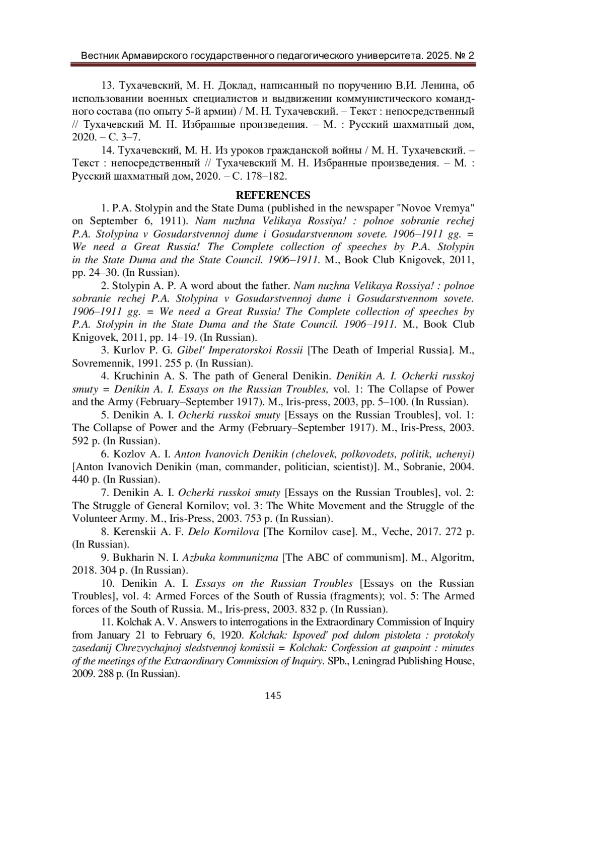 13. Тухачевский, М. Н. Доклад, написанный по поручению В.И. Ленина, об использовании военных специалистов и выдвижении коммунистического командного состава (по опыту 5-й армии) / М. Н. Тухачевский. - Текст: непосредственный // Тухачевский М. Н. Избранные произведения. - М.: Русский шахматный дом, 2020. - С. 3-7.