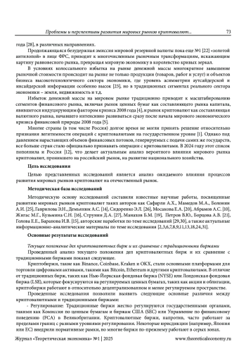 25. Сафарли, А. Х., Мамедов, М. А., Болонин, А. И. К вопросу о текущем состоянии и перспективах дальнейшего развития мирового рынка криптовалют // Финансы и управление. 2022. № 3. URL: https://nbpublish.com/library_read_article.php?id=38305 (дата обращения: 01.11.2024). DOI: 10.25136/2409-7802.2022.3.38305 EDN: KBYGJS