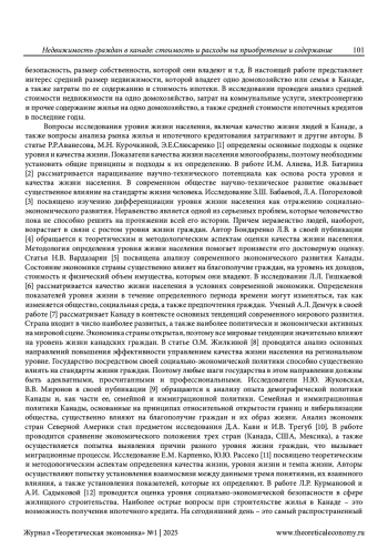 Вопросы исследования уровня жизни населения, включая качество жизни людей в Канаде, а также вопросы анализа рынка жилья и ипотечного кредитования затрагивают и другие авторы. В статье Р. Р. Аванесова, М. Н. Курочкиной, Э. Е. Слюсаренко [1] определены основные подходы к оценке уровня и качества жизни. Показатели качества жизни населения многообразны, поэтому необходимы установить общие принципы и подходы к их определению. В работе И. М. Алиева, И. В. Батарина [2] рассматривается наращивание научно-технического потенциала как основа роста уровня и качества жизни населения. В современном обществе научно-техническое развитие оказывает существенное влияние на стандарты жизни человека. Исследование З. Ш. Бабаевой, Л. А. Погореловой [3] посвящено изучению дифференциации уровня жизни населения как отражению социально-экономического развития. Неравенство является одной из серьезных проблем, которые человечество пока не способно решить на протяжении всей его истории.