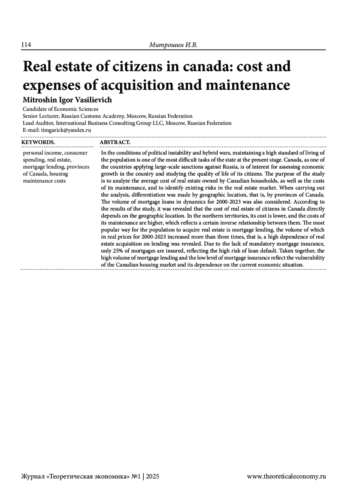 В условиях политической нестабильности и гибридных войн сохранение высокого уровня жизни населения является одной из самых трудных задач государства на современном этапе. Канада, как одна из стран, применяющая масштабные санкции против России, представляет интерес для оценки экономического роста в стране и исследования качества жизни ее граждан. Цель исследования - провести анализ средней стоимости недвижимости, которой владеют канадские домохозяйства, а также расходов на ее содержание, и выявить существующие риски на рынке недвижимости. При осуществлении анализа произведена дифференциация по географическому признаку, то есть по провинциям Канады. Также рассмотрен объем ипотечных кредитов в динамике за 2000-2023 гг. По результатам исследования выявлено, что стоимость недвижимости граждан в Канаде прямо зависит от географического расположения. На северных территориях ее стоимость ниже, а затраты на ее содержание выше, что отражают определенную обратную взаимосвязь между ними. Самым популярным способом приобретения недвижимости населением, является ипотечной кредитование, объем которого в реальных ценах за 2000-2023 гг. вырос более, чем в три раза, то есть выявлена высокая зависимость приобретения недвижимости от кредитования. В связи с отсутствием обязательного страхования ипотечного кредитования только 25% ипотечных кредитов застрахованы, что отражает высокий риск невозврата кредитов. В совокупности значительный объем ипотечного кредитования и низкая степень страхования ипотечных кредитов отражают уязвимость рынка недвижимости в Канаде и его зависимость от состояния экономики в текущем периоде.