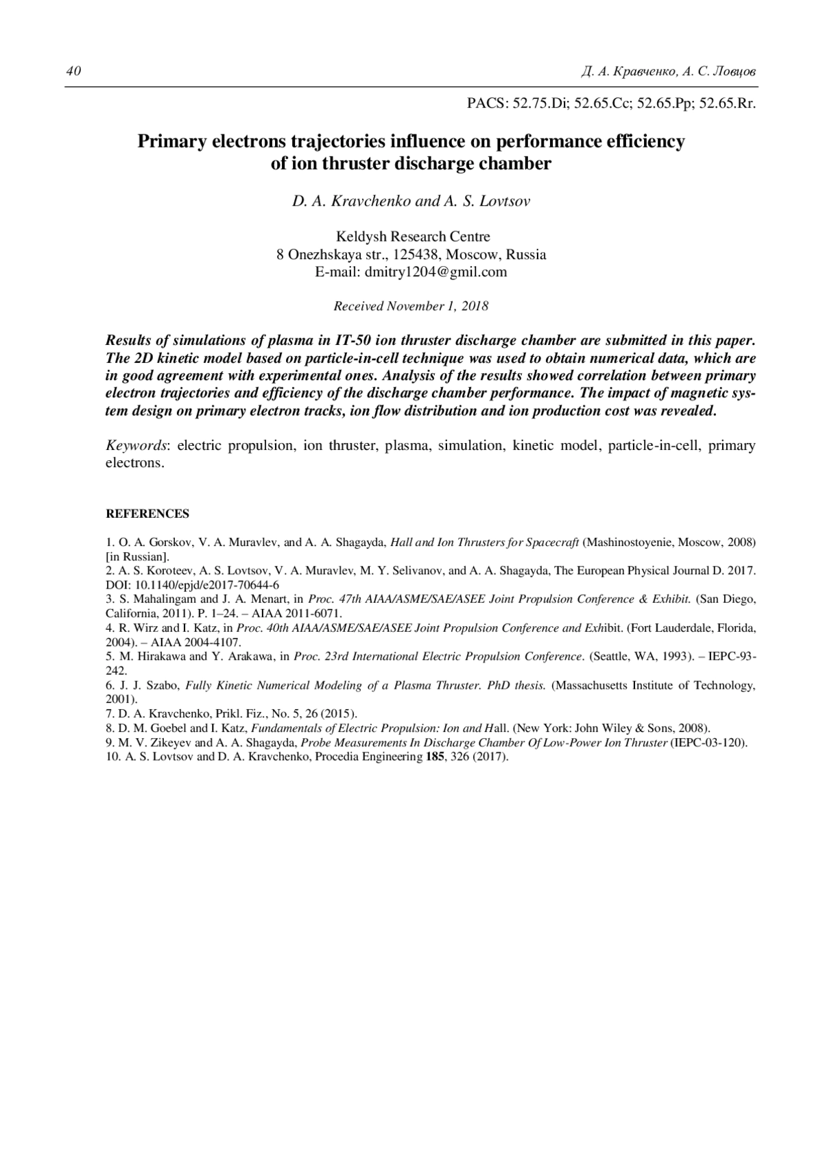6. Szabo J. J. Fully Kinetic Numerical Modeling of a Plasma Thruster (PhD thesis). – Massachusetts Institute of Technology, 2001.