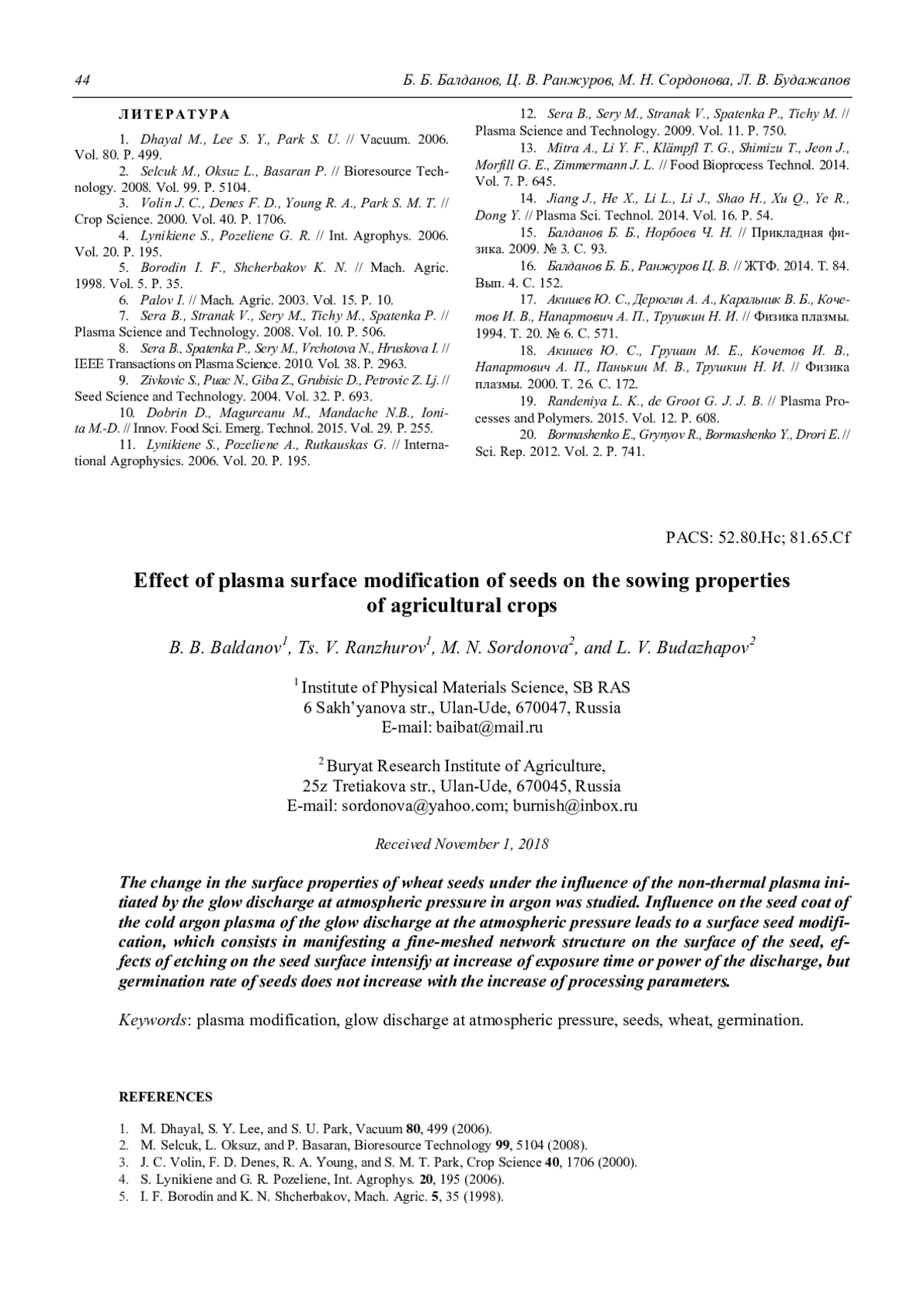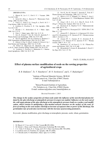 B. B. Baldanov, Ts. V. Ranzhurov, M. N. Sordonova, and L. V. Budazhapov Effect of plasma surface modification of seeds on the sowing properties of agricultural crops 41