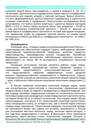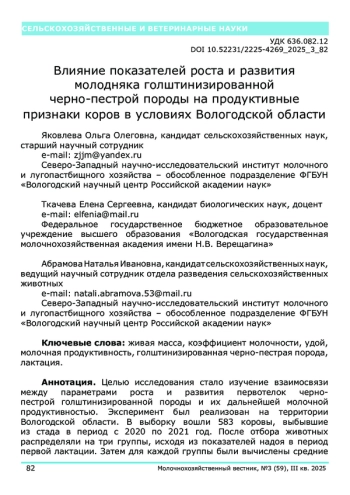Целью исследования стало изучение взаимосвязи между параметрами роста и развития первотелок чернопестрой голштинизированной породы и их дальнейшей молочной продуктивностью. Эксперимент был реализован на территории Вологодской области. В выборку вошли 583 коровы, выбывшие из стада в период с 2020 по 2021 год. После отбора животных распределяли на три группы, исходя из показателей надоя в период первой лактации. Затем для каждой группы были вычислены средние значения живой массы при рождении, а также в возрасте 6, 10, 12 и 18 месяцев. Дополнительно определялись живая масса и коэффициент молочности для первой, второй и третьей лактации. Важно отметить, что все сформированные группы животных содержались в идентичных условиях кормления и содержания. Результатами исследования было установлено, что третья группа животных с удоем за первую лактацию 8843–11153 кг имела самую высокую массу при рождении – 34,98 кг и при достижении хозяйственной зрелости – 422,61 кг. Данные по живой массе и коэффициенту молочности по трем лактациям показали, что первенство вновь за коровами третьей группы, их живая масса составляла от 566,01 до 638,03 кг, коэффициент молочности – от 1465,7 до 1661,8 кг.