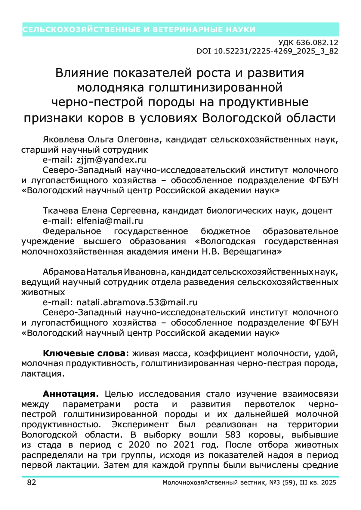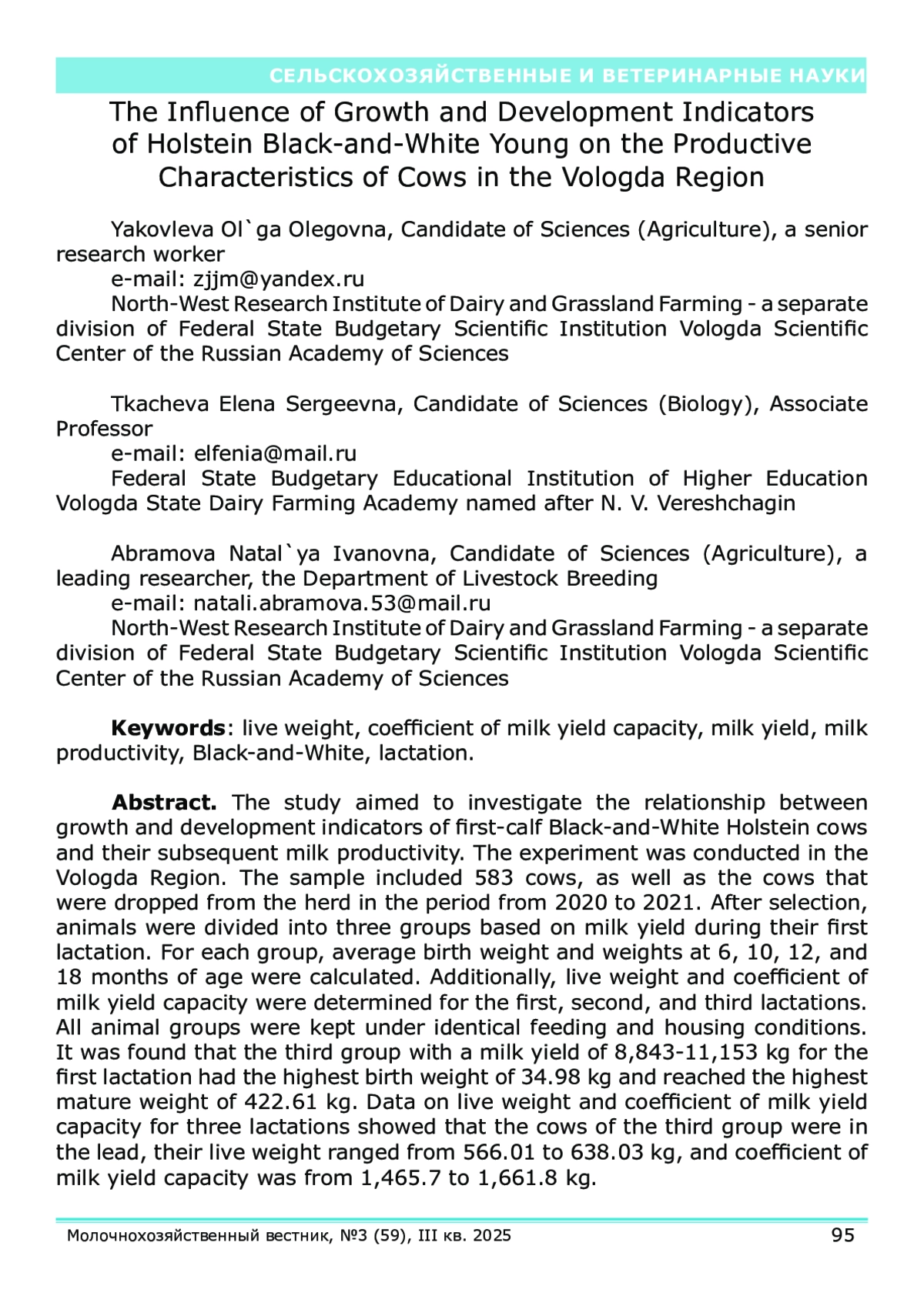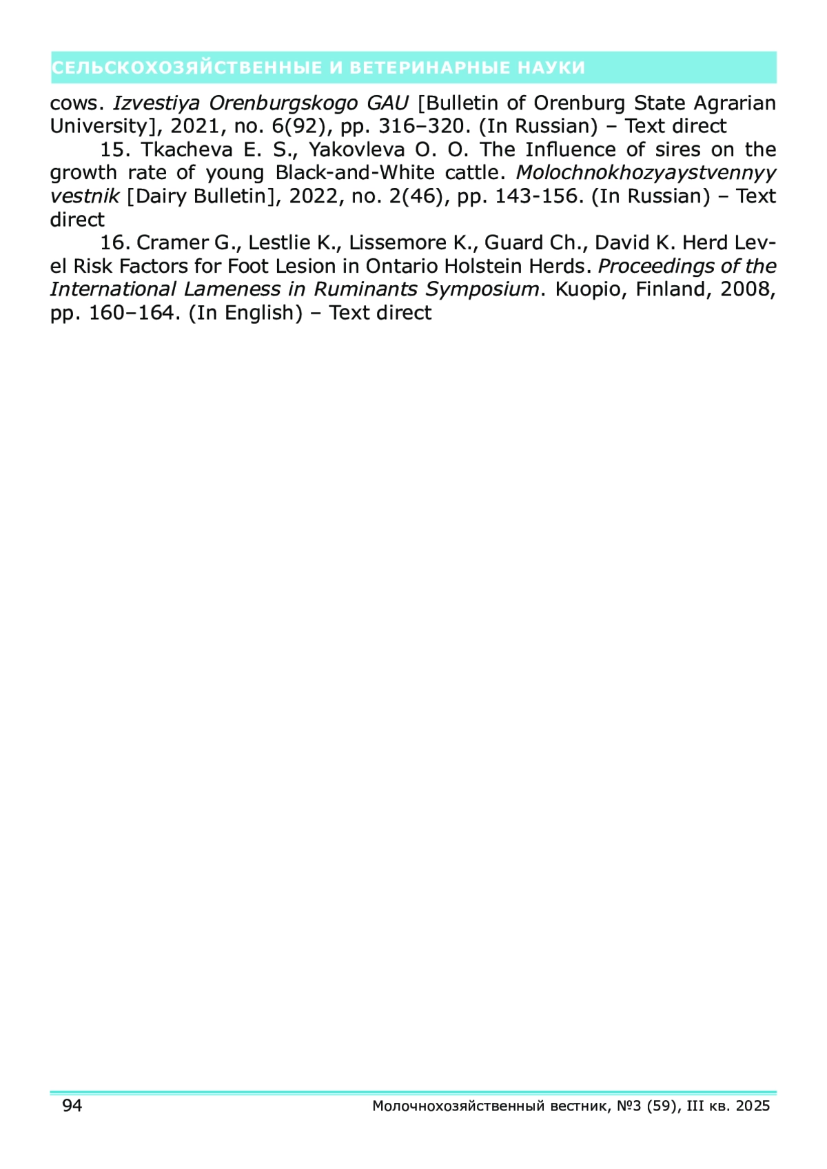 15. Ткачева, Е.С., Влияние быков-производителей на скорость роста молодняка крупного рогатого скота черно-пестрой породы / Е.С. Ткачева, О.О. Яковлева // Молочнохозяйственный вестник. - 2022. - № 2 (46). - С. 143-156.