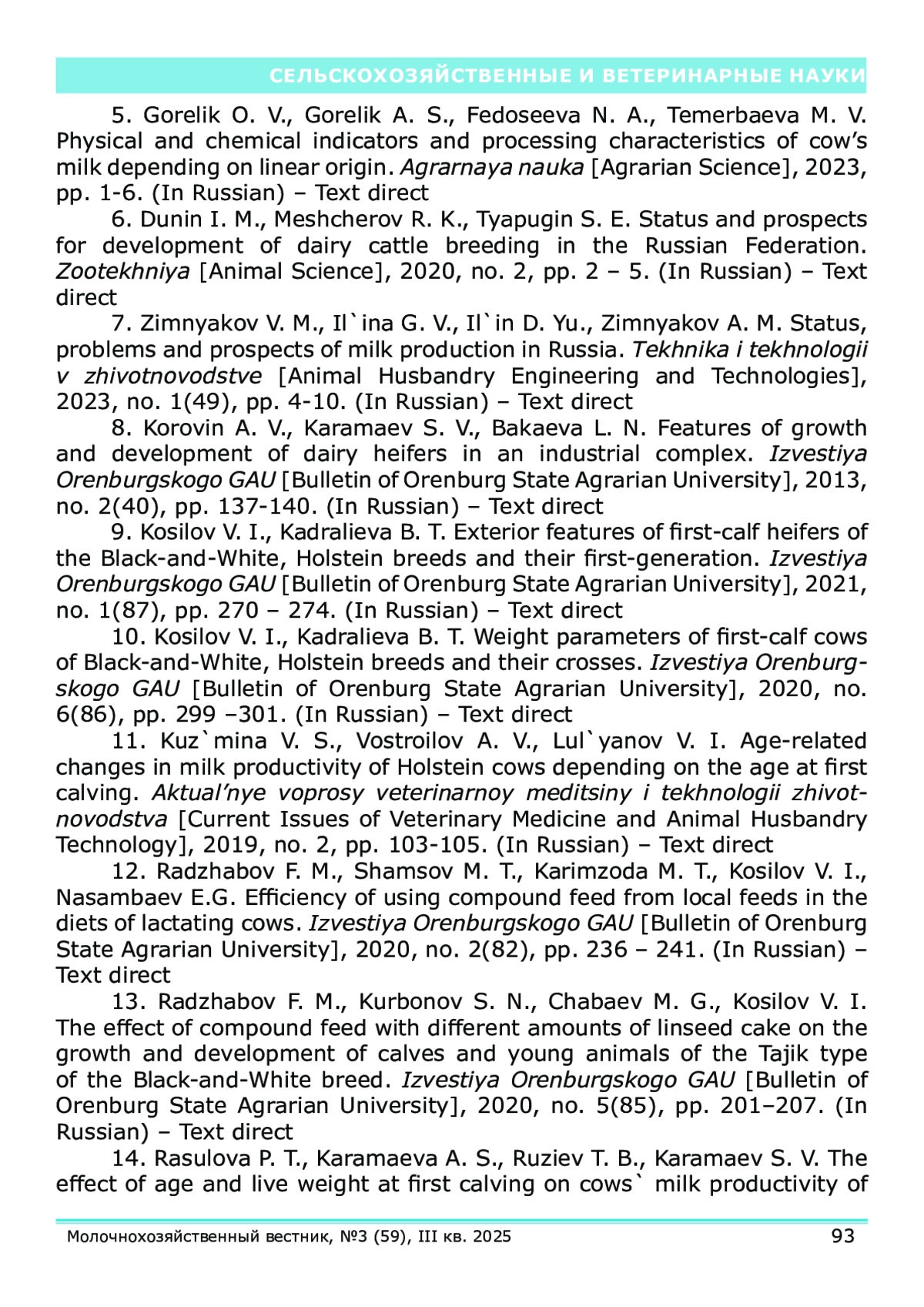 14. Влияние возраста и живой массы при первом отёле на молочную продуктивность коров / П.Т. Расулова, А.С. Карамаева, Т.Б. Рузиев, С.В. Карамаев // Известия Оренбургского ГАУ. - 2021. - № 6 (92). - С. 316-320.