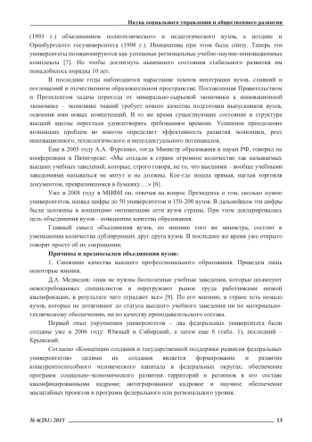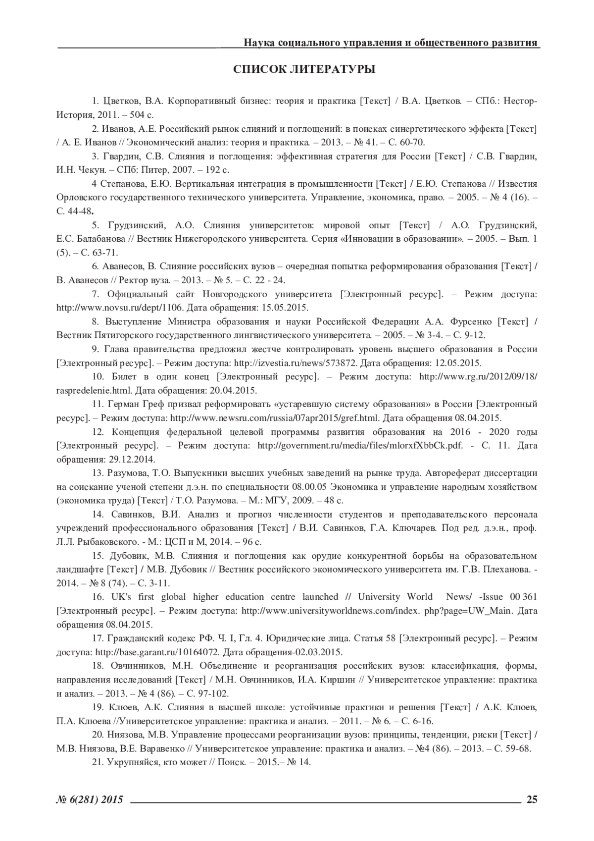 Ключевые фразы: реорганизация университетов, история интеграции вузов, зарубежные практики, федеральные и национальные исследовательские университеты, классификация форм реорганизации, ПРЕДПОСЫЛКИ, причины и цели реорганизации вузов, отечественный опыт, синергетические эффекты, управление рисками