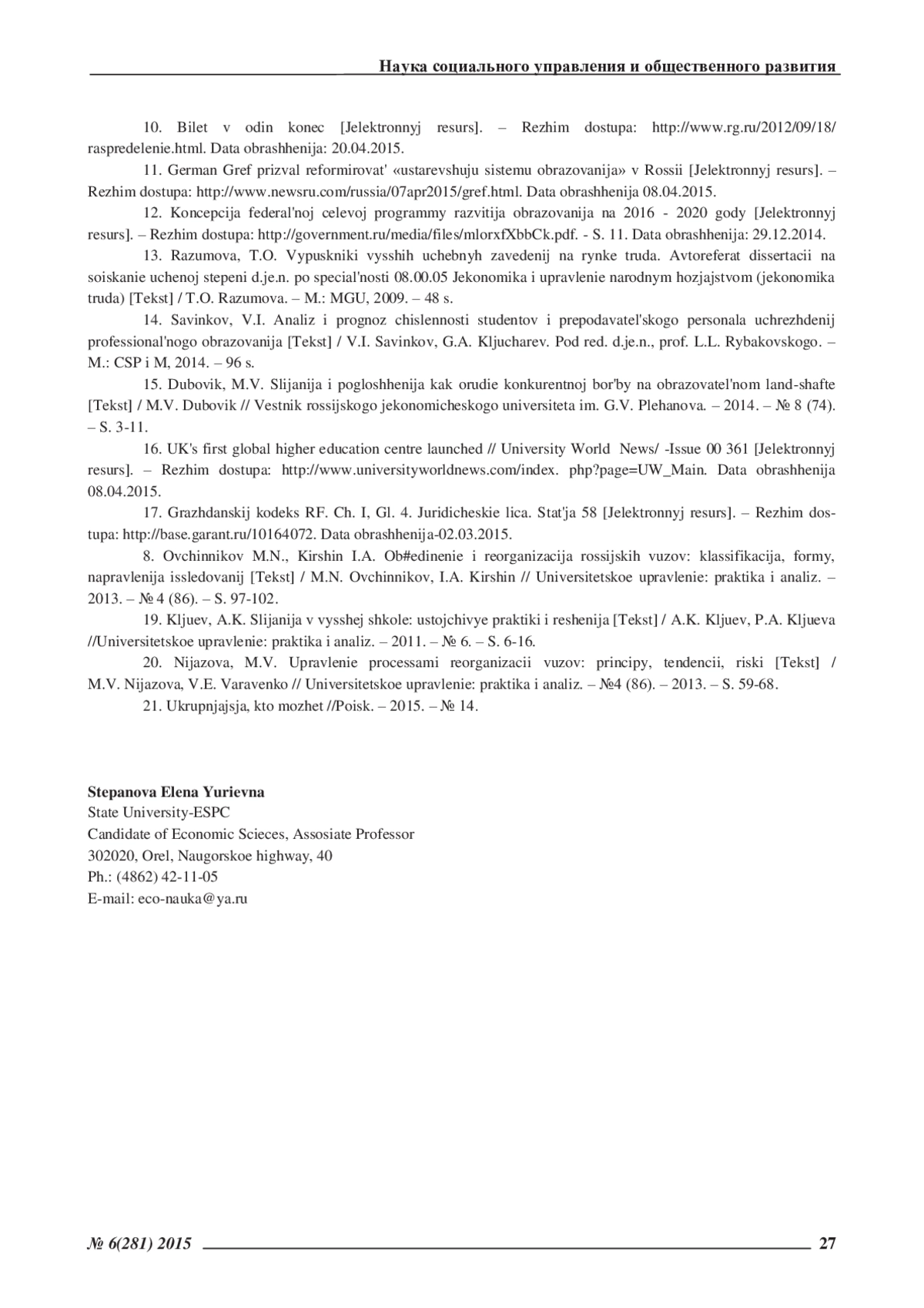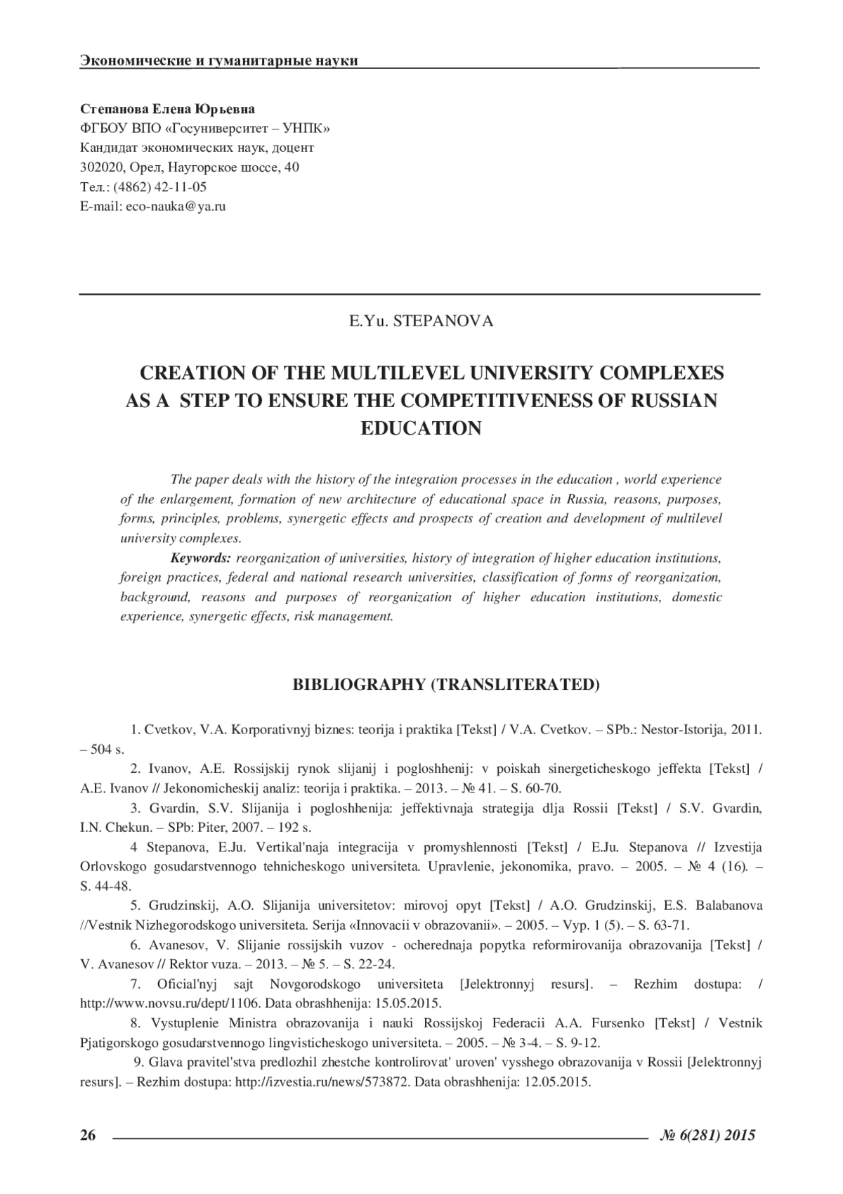 СТЕПАНОВА Е. Ю. СОЗДАНИЕ МНОГОУРОВНЕВЫХ УНИВЕРСИТЕТСКИХ КОМПЛЕКСОВ КАК ШАГ К ОБЕСПЕЧЕНИЮ КОНКУРЕНТОСПОСОБНОСТИ РОССИЙСКОГО ОБРАЗОВАНИЯ // ЭКОНОМИЧЕСКИЕ И ГУМАНИТАРНЫЕ НАУКИ. 2015. № 6 (281)