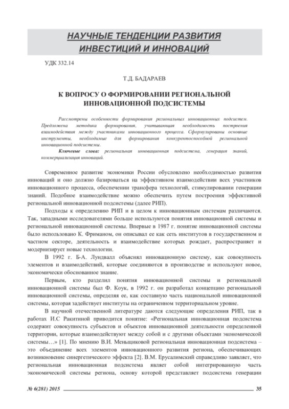 БАДАРАЕВ Т. Д. К ВОПРОСУ О ФОРМИРОВАНИИ РЕГИОНАЛЬНОЙ ИННОВАЦИОННОЙ ПОДСИСТЕМЫ // ЭКОНОМИЧЕСКИЕ И ГУМАНИТАРНЫЕ НАУКИ. 2015. № 6 (281)