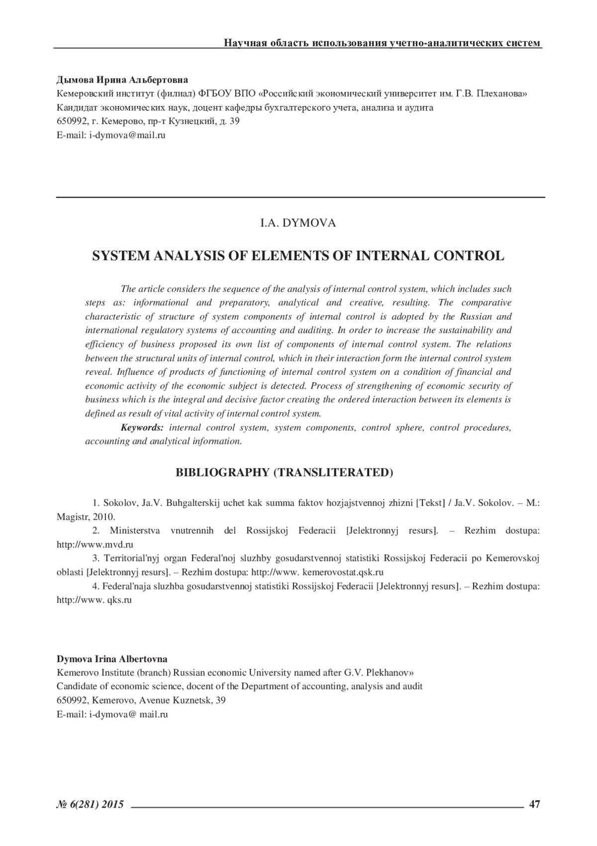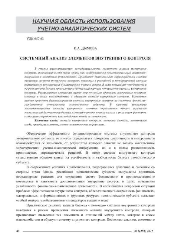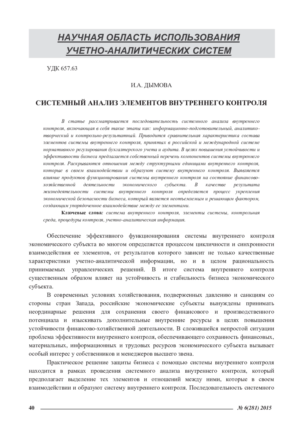 ДЫМОВА И. А. СИСТЕМНЫЙ АНАЛИЗ ЭЛЕМЕНТОВ ВНУТРЕННЕГО КОНТРОЛЯ // ЭКОНОМИЧЕСКИЕ И ГУМАНИТАРНЫЕ НАУКИ. 2015. № 6 (281)