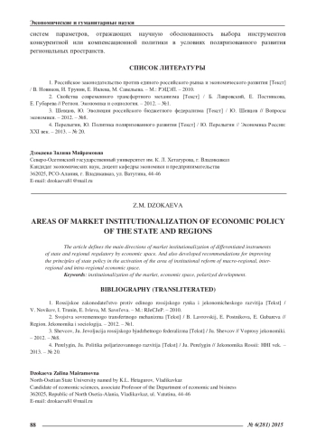 ДЗОКАЕВА З. М. НАПРАВЛЕНИЯ РЫНОЧНОЙ ИНСТИТУЦИОНАЛИЗАЦИИ ЭКОНОМИЧЕСКОЙ ПОЛИТИКИ ГОСУДАРСТВА И РЕГИОНОВ // ЭКОНОМИЧЕСКИЕ И ГУМАНИТАРНЫЕ НАУКИ. 2015. № 6 (281)