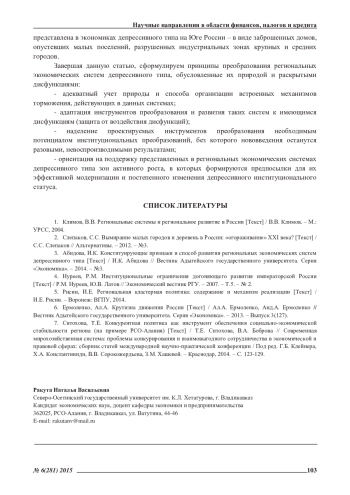 3. Абидова, И.К. Конституирующие признаки и способ развития региональных экономических систем депрессивного типа [Текст] / И.К. Абидова // Вестник Адыгейского государственного университета. Серия «Экономика». - 2014. - №3. EDN: TTGJND