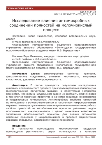 В статье приводятся результаты исследования динамики молочнокислого процесса при культивировании консорциума микроорганизмов йогуртовой закваски в присутствии экстрактов пряностей. Пряности в натуральном виде и их экстракты применяются в технологии молочных продуктов в качестве пищевых консервантов и пищевкусовых компонентов. Антимикробные свойства пряностей по отношению к условно-патогенным и патогенным микроорганизмам изучены, поэтому актуальным является изучение влияния антимикробных свойств пряностей на метаболические процессы различных видов молочнокислых микроорганизмов с целью выявления возможного торможения молочнокислого процесса. Для оценки активности обменных процессов у микроорганизмов в процессе ферментации образцов определяли электрохимические показатели.