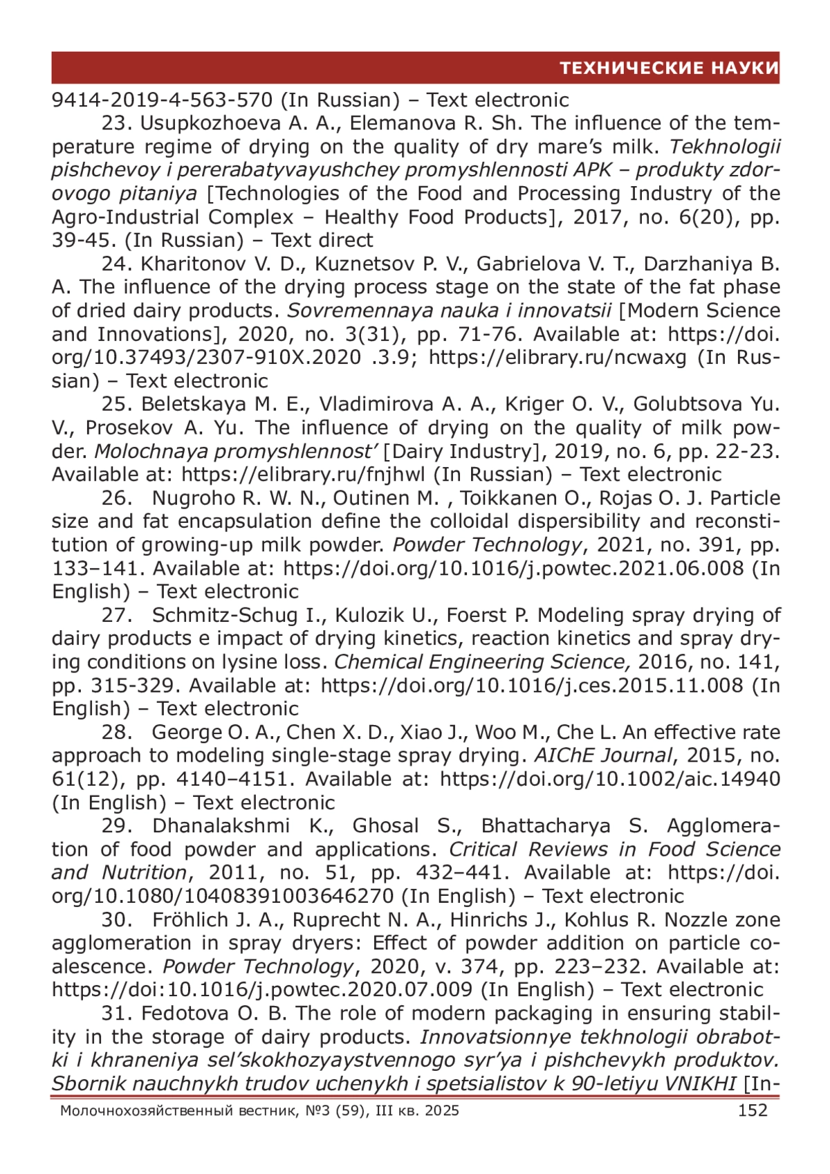 25. Усупкожоева, А.А. Влияние температурного режима сушки на качественные показатели сухого кобыльего молока / А.А. Усупкожоева, Р.Ш. Элеманова // Технологии пищевой и перерабатывающей промышленности АПК - продукты здорового питания. - 2017. - № 6 (20). С. 39-45. EDN: YSUQUC