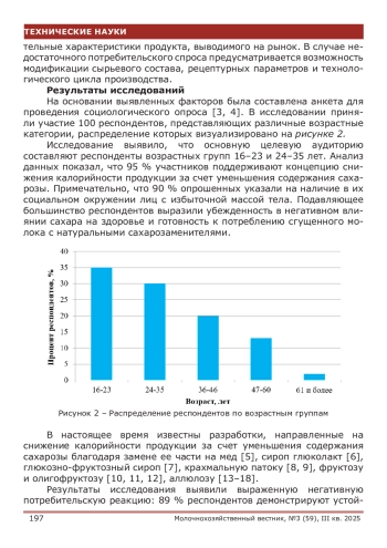 Представлены результаты социологического исследования потребительских предпочтений на рынке сгущенного молока с натуральными сахарозаменителями. На основе результатов опроса ста респондентов выявлены ключевые факторы, влияющие на выбор продукта: тип подсластителя (61 % предпочитают стевию), упаковка (дой-пак – 54 %) и ценовой диапазон (60–65 руб. – 36 %). Установлено, что 89 % потребителей негативно относятся к искусственным добавкам, а 62 % целенаправленно выбирают продукты с натуральными заменителями сахара. Исследование подтвердило высокий спрос на низкокалорийные решения, сохраняющие традиционный вкус. Результаты имеют практическую значимость для производителей молочной продукции, ориентированных на тренды здорового питания.