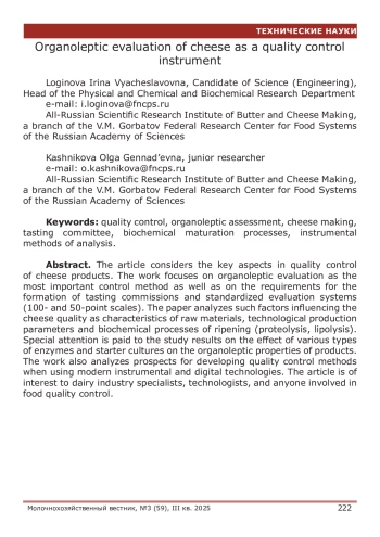 В статье рассмотрены ключевые аспекты контроля качества сырной продукции. Основное внимание уделено органолептической оценке как важнейшему методу контроля, включая требования к формированию дегустационных комиссий и стандартизированным системам оценки (100- и 50-балльные шкалы). Подробно проанализированы факторы, влияющие на качество сыров: характеристики сырья, технологические параметры производства и биохимические процессы созревания (протеолиз, липолиз). Особое внимание уделено результатам исследований влияния различных типов ферментов и заквасочных культур на органолептические свойства продукции. Рассмотрены перспективы развития методов контроля качества с использованием современных инструментальных и цифровых технологий. Статья представляет интерес для специалистов молочной промышленности, технологов и всех, кто занимается вопросами контроля качества пищевой продукции.