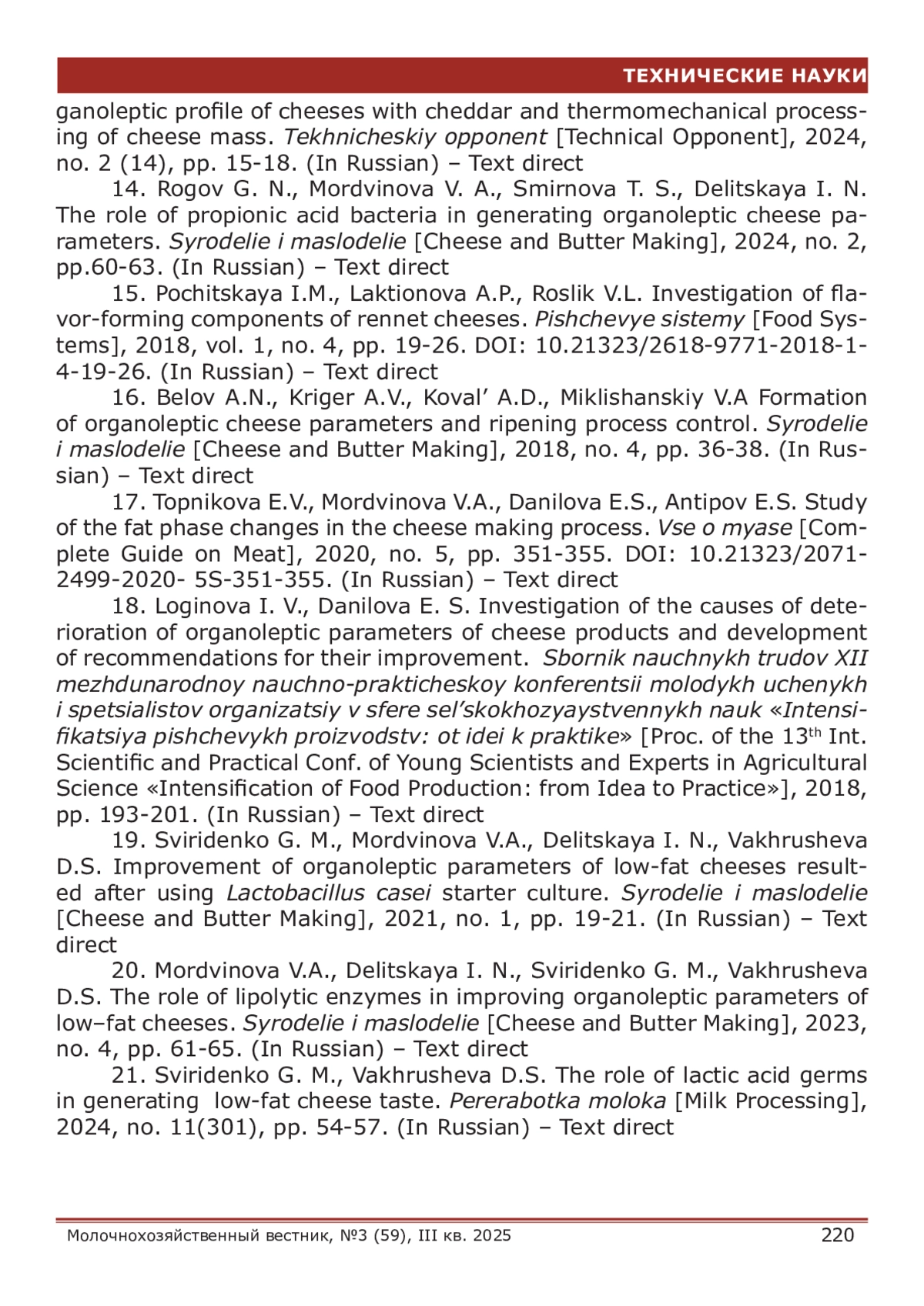 14. Роль пропионовокислых бактерий в формировании органолептических показателей сыров / Г.Н. Рогов, В.А. Мордвинова, Т.С. Смирнова, И.Н. Делицкая // Сыроделие и маслоделие. - 2024. - №2. - С. 60-63.