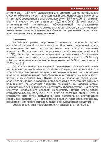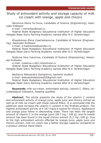 Изучены содержание витамина С и антиоксидантная активность апельсинового и яблочного соков, экстракта цикория и молочного мороженого с этими натуральными наполнителями. Сделан вывод о том, что используемые добавки повышают содержание витамина С в готовом продукте. Наибольшая антиокислительная активность (4,167 мг/г) характерна для цикория. Далее по убыванию следуют яблочное пюре и апельсиновый сок. Наибольшее количество витамина С содержится в апельсиновом соке (28,7 мг/100 г), наименьшее – в жидком экстракте цикория (0,2 мг/100 г). За счет высокой антиоксидантной активности, обусловленной использованием апельсинового и яблочного соков, экстракта цикория, молочное мороженое имеет лучшую хранимоспособность по сравнению с продуктом, производимом без этих наполнителей.