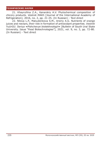 22. Нилова, Л.П. Нутриенты апельсиновых соков и нектаров, роль в формировании антиоксидантных свойств / Л.П. Нилова, С.М. Малютенкова, А.Г. Арсирий // Вестник ЮУрГУ. Серия “Пищевые биотехнологии”. - 2021. - Т. 9, №3. - С. 72-80.