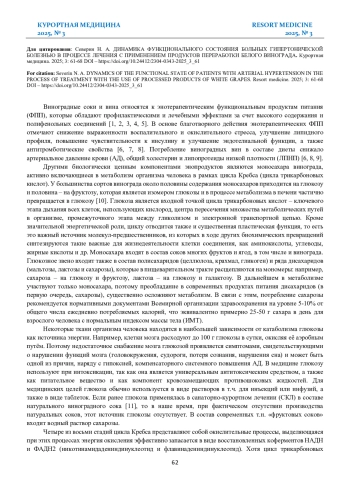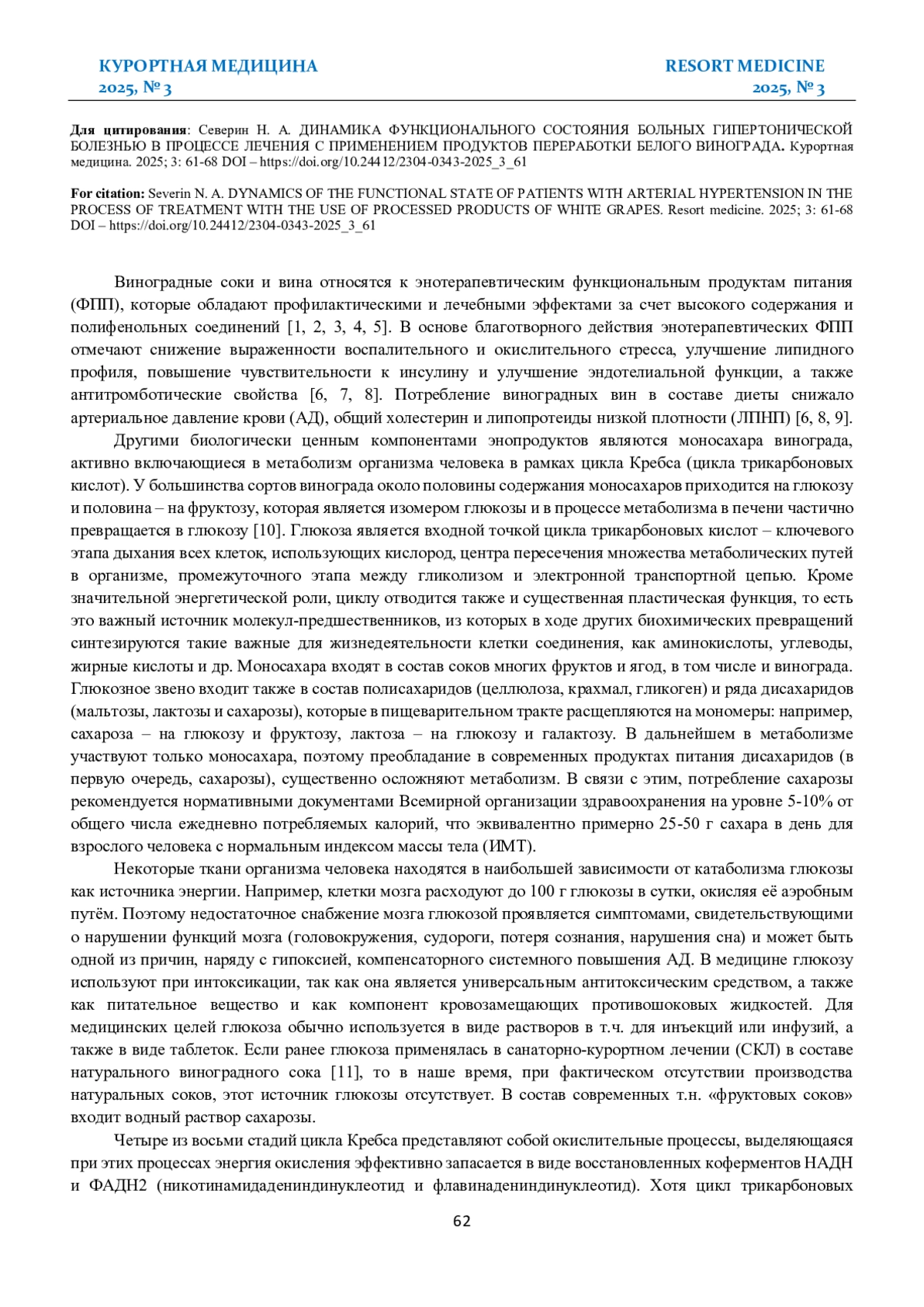 Виноградные соки и вина относятся к энотерапевтическим функциональным продуктам питания (ФПП), которые обладают профилактическими и лечебными эффектами за счет высокого содержания и полифенольных соединений [1, 2, 3, 4, 5]. В основе благотворного действия энотерапевтических ФПП отмечают снижение выраженности воспалительного и окислительного стресса, улучшение липидного профиля, повышение чувствительности к инсулину и улучшение эндотелиальной функции, а также антитромботические свойства [6, 7, 8]. Потребление виноградных вин в составе диеты снижало артериальное давление крови (АД), общий холестерин и липопротеиды низкой плотности (ЛПНП) [6, 8, 9].