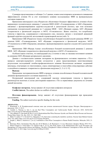 Выводы. Виноградный сок рекомендуется включить в состав диетотерапии пациентов с ГБ и в нормативные документы по лечению данной патологии.