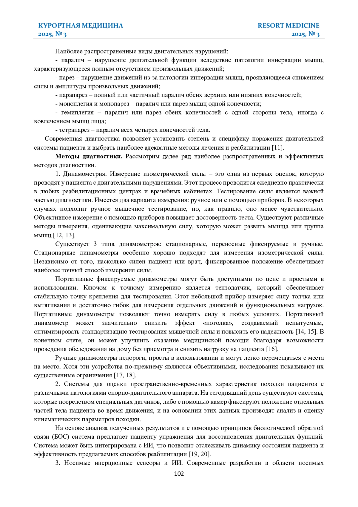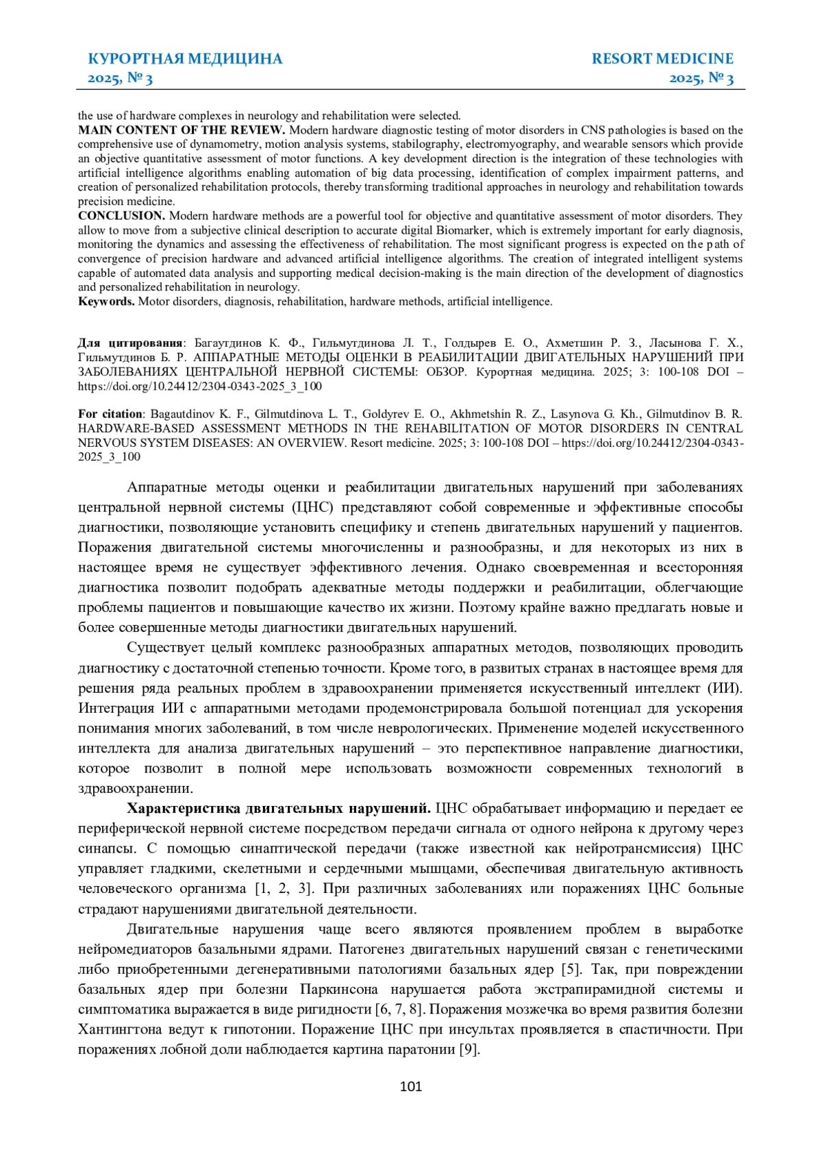 Заключение. Современные аппаратные методы представляют собой мощный инструмент для объективной и количественной оценки двигательных нарушений. Они позволяют перейти от субъективного клинического описания к точным цифровым Biomarker, что крайне важно для ранней диагностики, мониторинга динамики и оценки эффективности реабилитации. Наиболее значимый прогресс ожидается на пути конвергенции точного аппаратного обеспечения и передовых алгоритмов искусственного интеллекта. Создание интегрированных интеллектуальных систем, способных к автоматизированному анализу данных и поддержке принятия врачебных решений, является магистральным направлением развития диагностики и персонализированной реабилитации в неврологии.