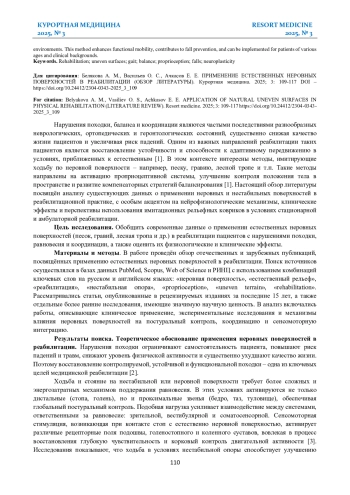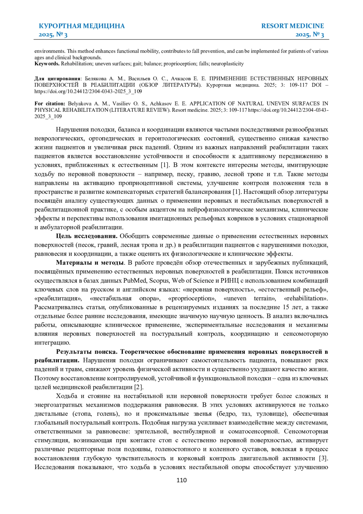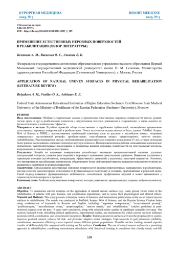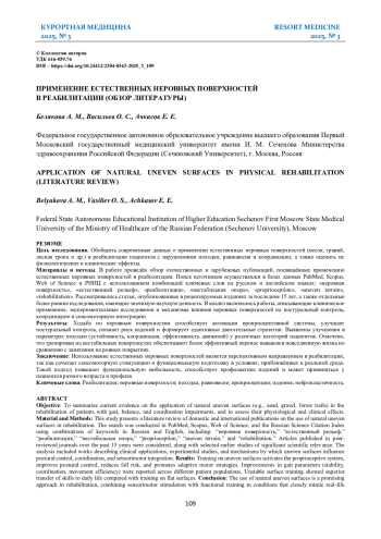 Материалы и методы. В работе проведён обзор отечественных и зарубежных публикаций, посвящённых применению естественных неровных поверхностей в реабилитации. Поиск источников осуществлялся в базах данных PubMed, Scopus, Web of Science и РИНЦ с использованием комбинаций ключевых слов на русском и английском языках: «неровная поверхность», «естественный рельеф», «реабилитация», «нестабильная опора», «proprioception», «uneven terrain», «rehabilitation». Рассматривались статьи, опубликованные в рецензируемых изданиях за последние 15 лет, а также отдельные более ранние исследования, имеющие значимую научную ценность. В анализ включались работы, описывающие клиническое применение, экспериментальные исследования и механизмы влияния неровных поверхностей на постуральный контроль, координацию и сенсомоторную интеграцию.