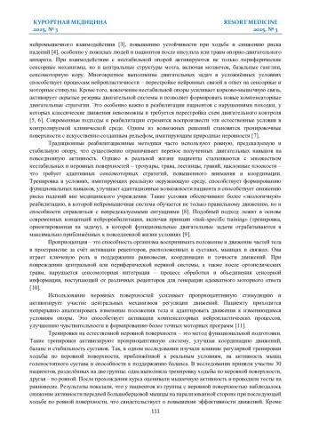 Нарушения походки, баланса и координации являются частыми последствиями разнообразных неврологических, ортопедических и геронтологических состояний, существенно снижая качество жизни пациентов и увеличивая риск падений. Одним из важных направлений реабилитации таких пациентов является восстановление устойчивости и способности к адаптивному передвижению в условиях, приближенных к естественным [1]. В этом контексте интересны методы, имитирующие ходьбу по неровной поверхности – например, песку, гравию, лесной тропе и т. п. Такие методы направлены на активацию проприоцептивной системы, улучшение контроля положения тела в пространстве и развитие компенсаторных стратегий балансирования [1]. Настоящий обзор литературы посвящён анализу существующих данных о применении неровных и нестабильных поверхностей в реабилитационной практике, с особым акцентом на нейрофизиологические механизмы, клинические эффекты и перспективы использования имитационных рельефных ковриков в условиях стационарной и амбулаторной реабилитации.