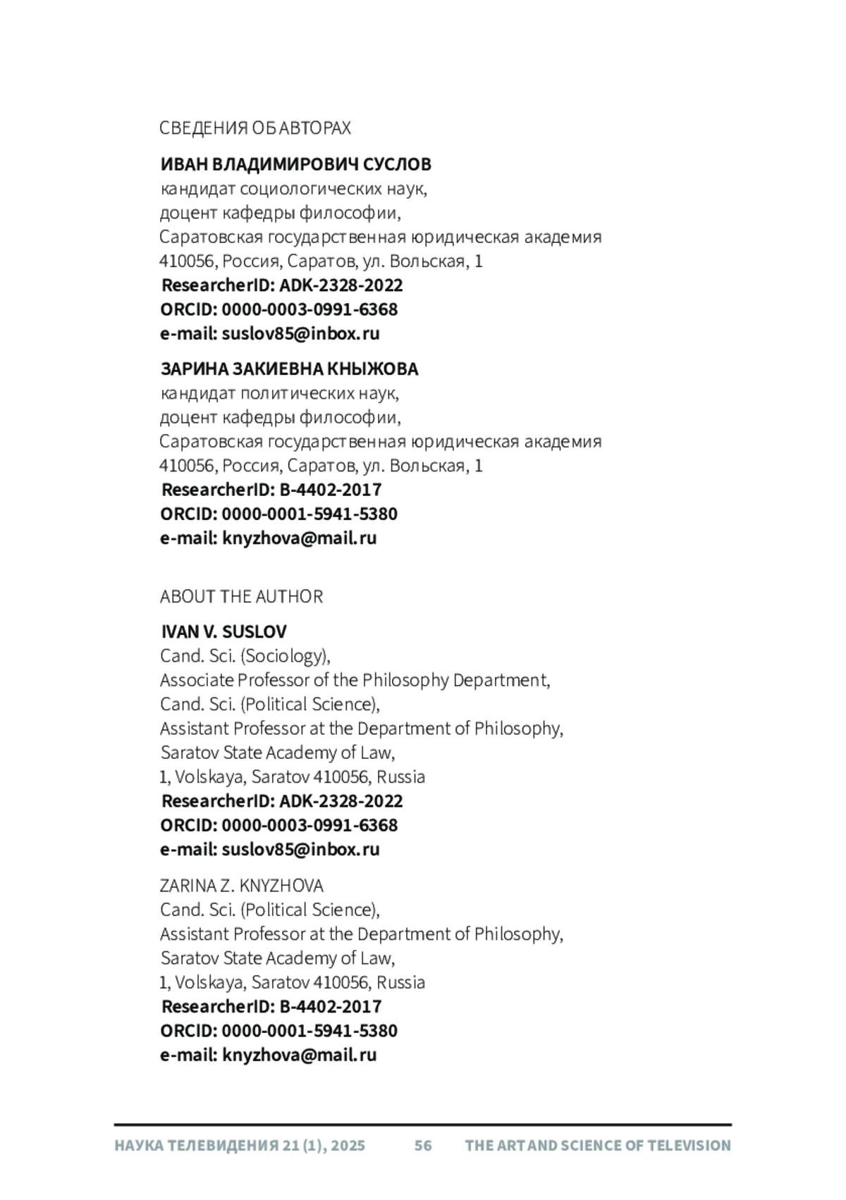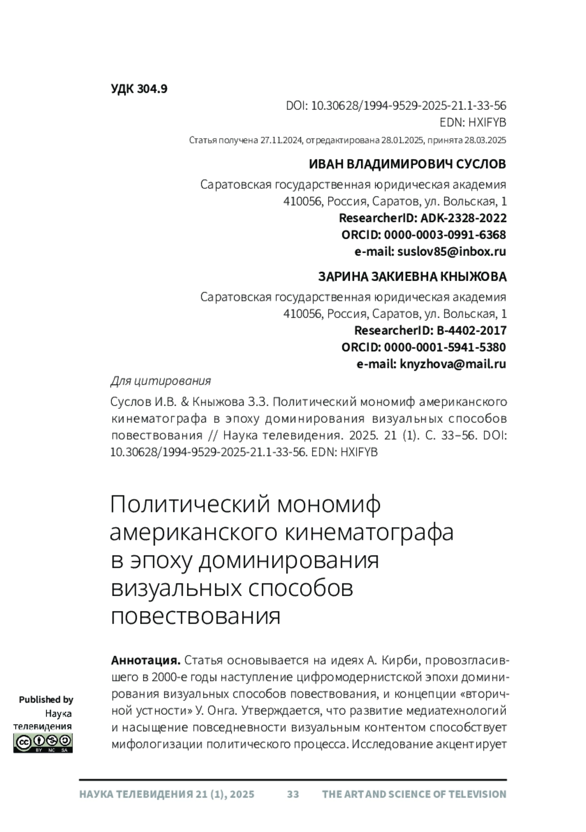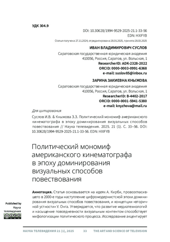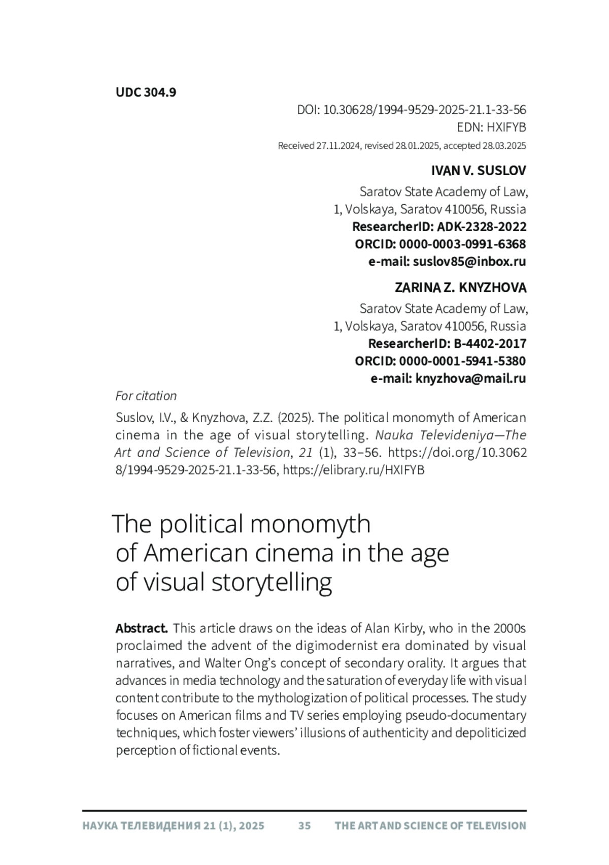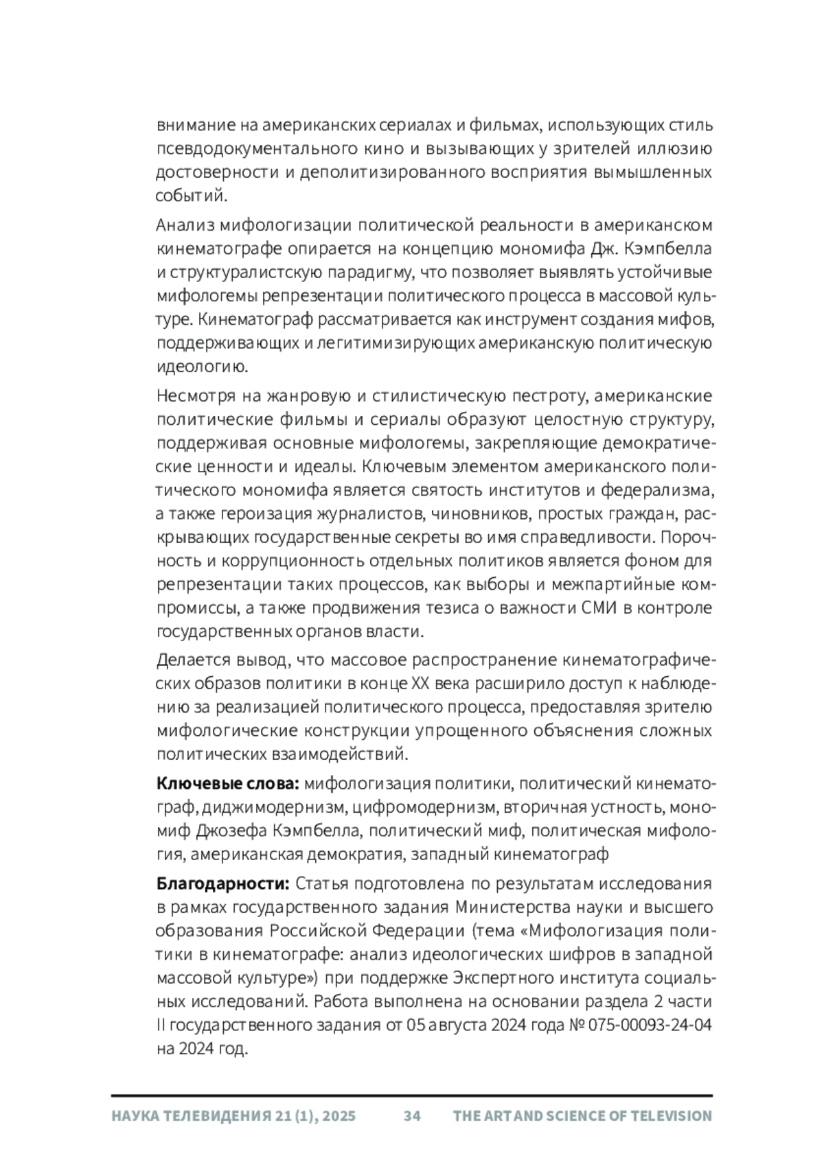 Статья основывается на идеях А. Кирби, провозгласившего в 2000-е годы наступление цифромодернистской эпохи доминирования визуальных способов повествования, и концепции «вторичной устности» У. Онга. Утверждается, что развитие медиатехнологий и насыщение повседневности визуальным контентом способствует мифологизации политического процесса. Исследование акцентирует внимание на американских сериалах и фильмах, использующих стиль псевдодокументального кино и вызывающих у зрителей иллюзию достоверности и деполитизированного восприятия вымышленных событий. Анализ мифологизации политической реальности в американском кинематографе опирается на концепцию мономифа Дж. Кэмпбелла и структуралистскую парадигму, что позволяет выявлять устойчивые мифологемы репрезентации политического процесса в массовой культуре. Кинематограф рассматривается как инструмент создания мифов, поддерживающих и легитимизирующих американскую политическую идеологию. Несмотря на жанровую и стилистическую пестроту, американские политические фильмы и сериалы образуют целостную структуру, поддерживая основные мифологемы, закрепляющие демократические ценности и идеалы. Ключевым элементом американского политического мономифа является святость институтов и федерализма, а также героизация журналистов, чиновников, простых граждан, раскрывающих государственные секреты во имя справедливости. Порочность и коррупционность отдельных политиков является фоном для репрезентации таких процессов, как выборы и межпартийные компромиссы, а также продвижения тезиса о важности СМИ в контроле государственных органов власти. Делается вывод, что массовое распространение кинематографических образов политики в конце XX века расширило доступ к наблюдению за реализацией политического процесса, предоставляя зрителю мифологические конструкции упрощенного объяснения сложных политических взаимодействий.
