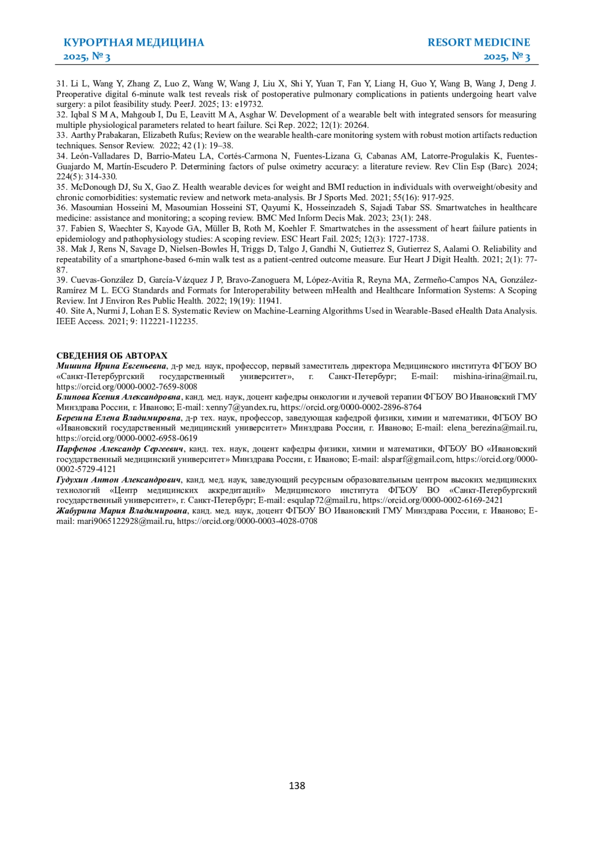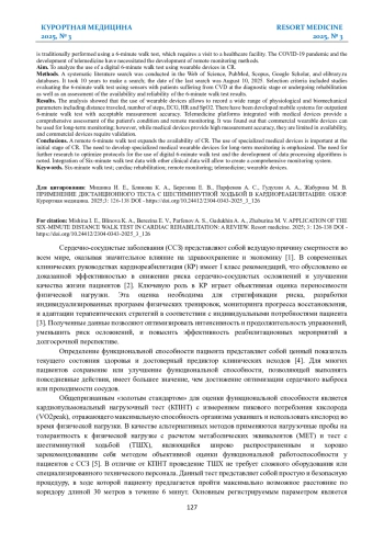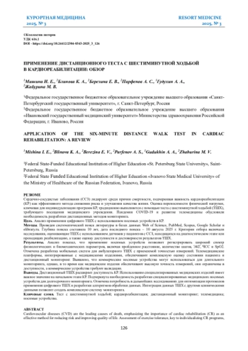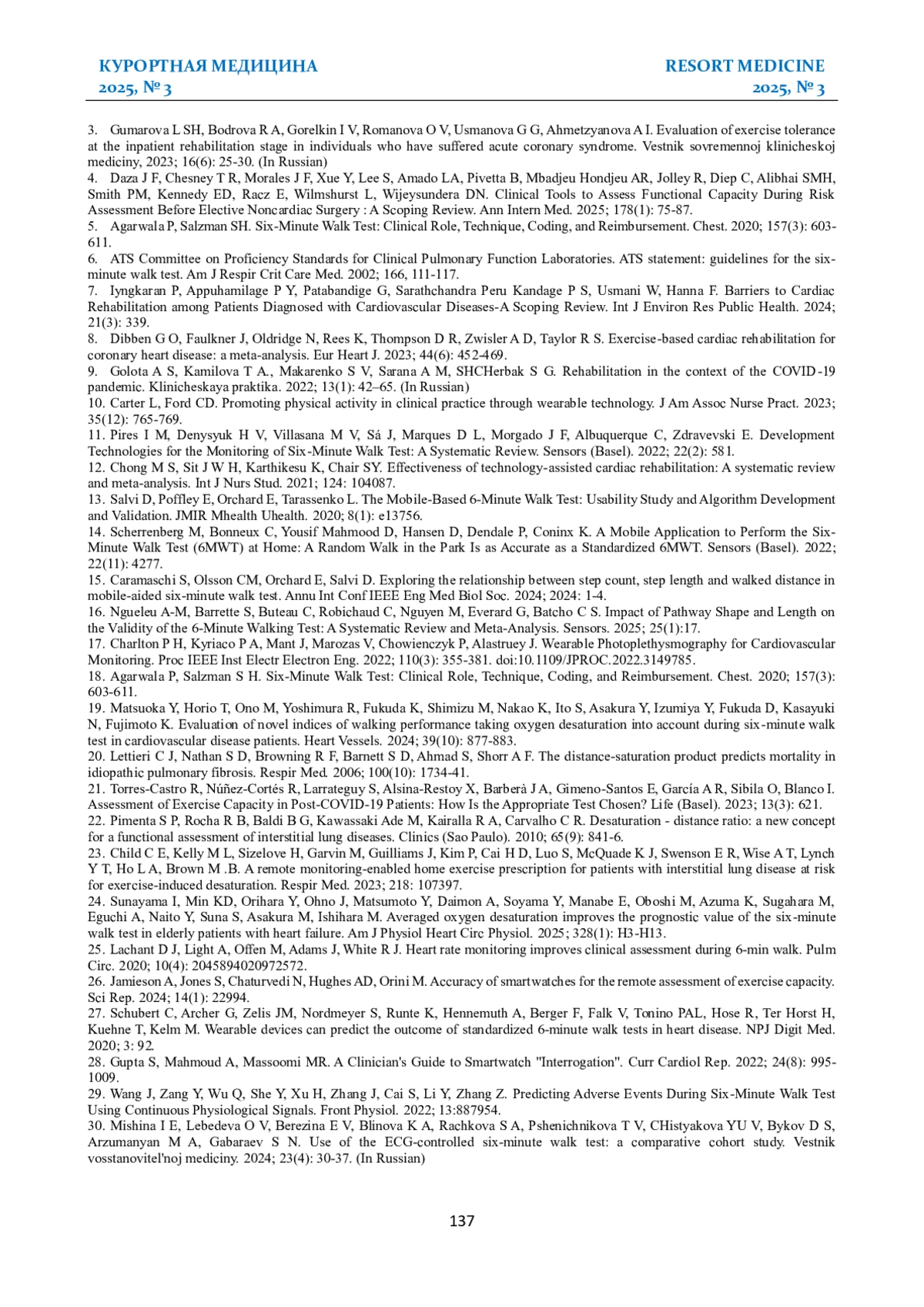 30. Мишина И. Е., Лебедева О. В., Березина Е. В., Блинова К. А., Рачкова С. А., Пшеничникова Т. В., Чистякова Ю. В., Быков Д. С., Арзуманян М. А., Габараев С. Н. Применение ЭКГ-контролируемого теста с шестиминутной ходьбой: сравнительное когортное исследование. Вестник восстановительной медицины. 2024; 23(4): 30-37. DOI: 10.38025/2078-1962-2024-23-4-30-37