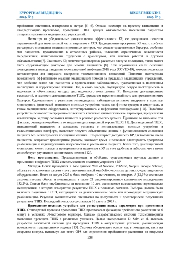 Методы. Проведен систематический поиск литературы в базах данных Web of Science, PubMed, Scopus, Google Scholar и elibrary. ru. Глубина поиска составила 10 лет, дата последнего поиска – 10 августа 2025 г. Критерии отбора включали исследования, оценивающие ТШХ с использованием датчиков у пациентов с ССЗ, находящихся на диагностическом этапе или проходящих реабилитацию, а также оценку доступности и достоверности результатов ТШХ.