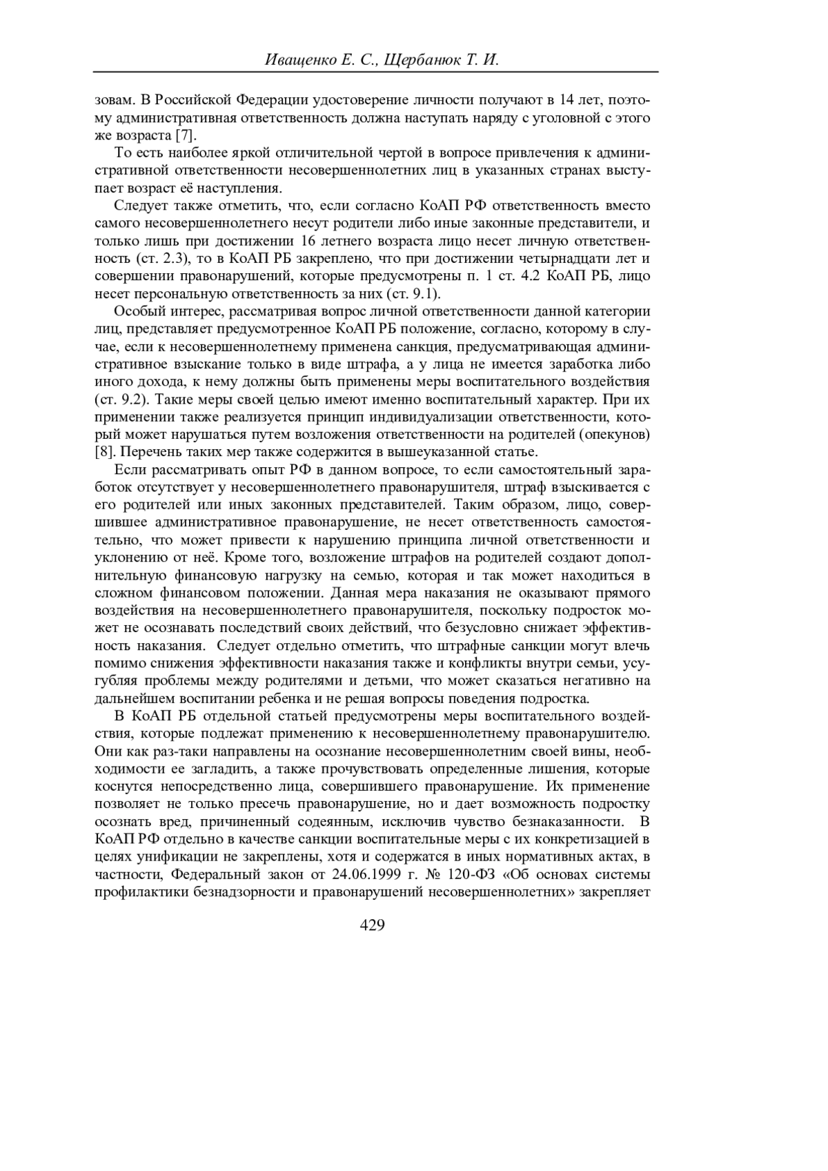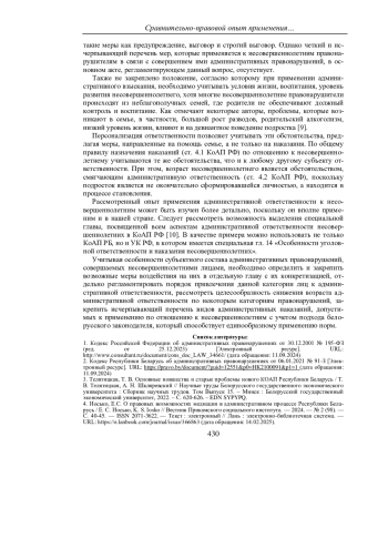 5. Иванова, Л. А. Административная ответственность несовершеннолетних / Л. А. Иванова // Аграрное и земельное право. - 2024. - № 8(236). - С. 113-116. DOI: 10.47643/1815-1329_2024_8_113 EDN: EECQMA